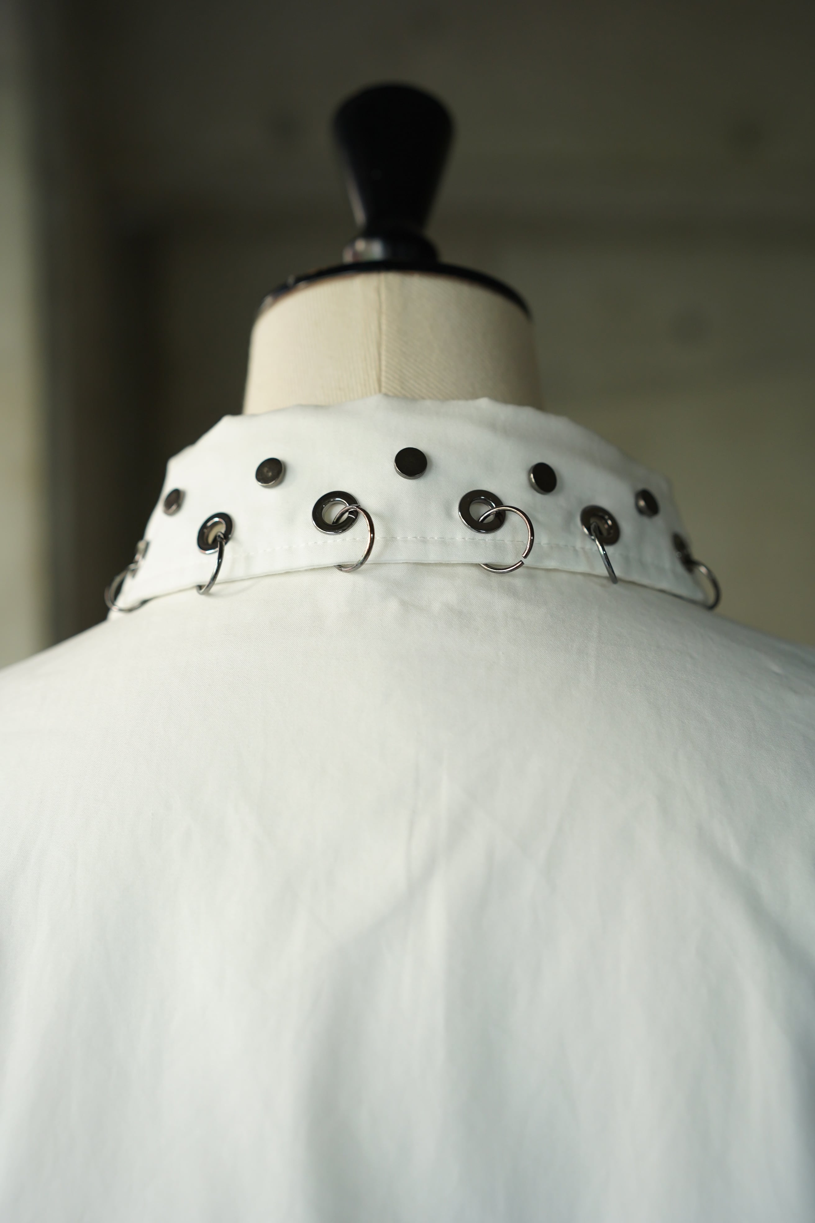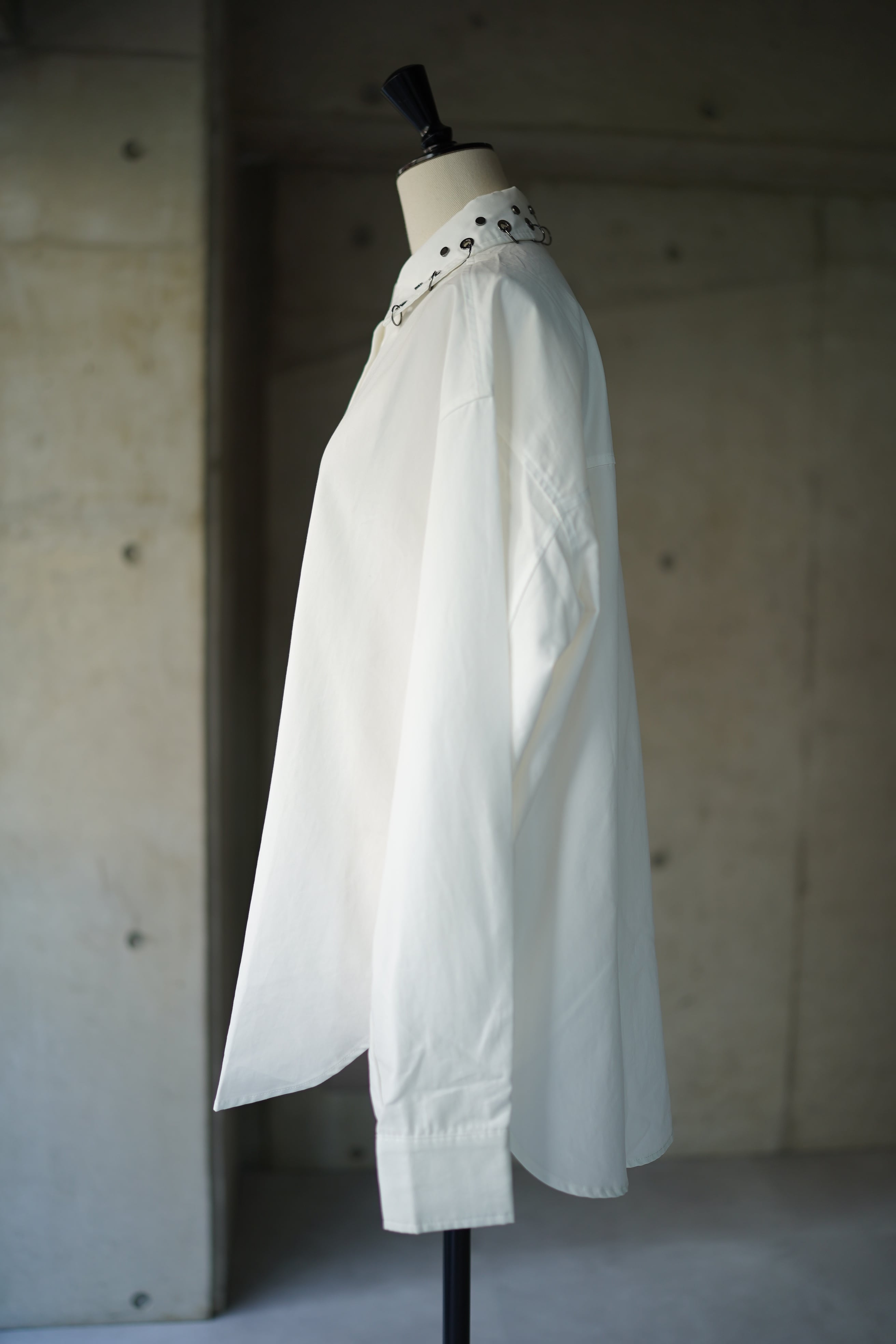 襟元のスタッズが特徴的なオーバーサイズシャツ。