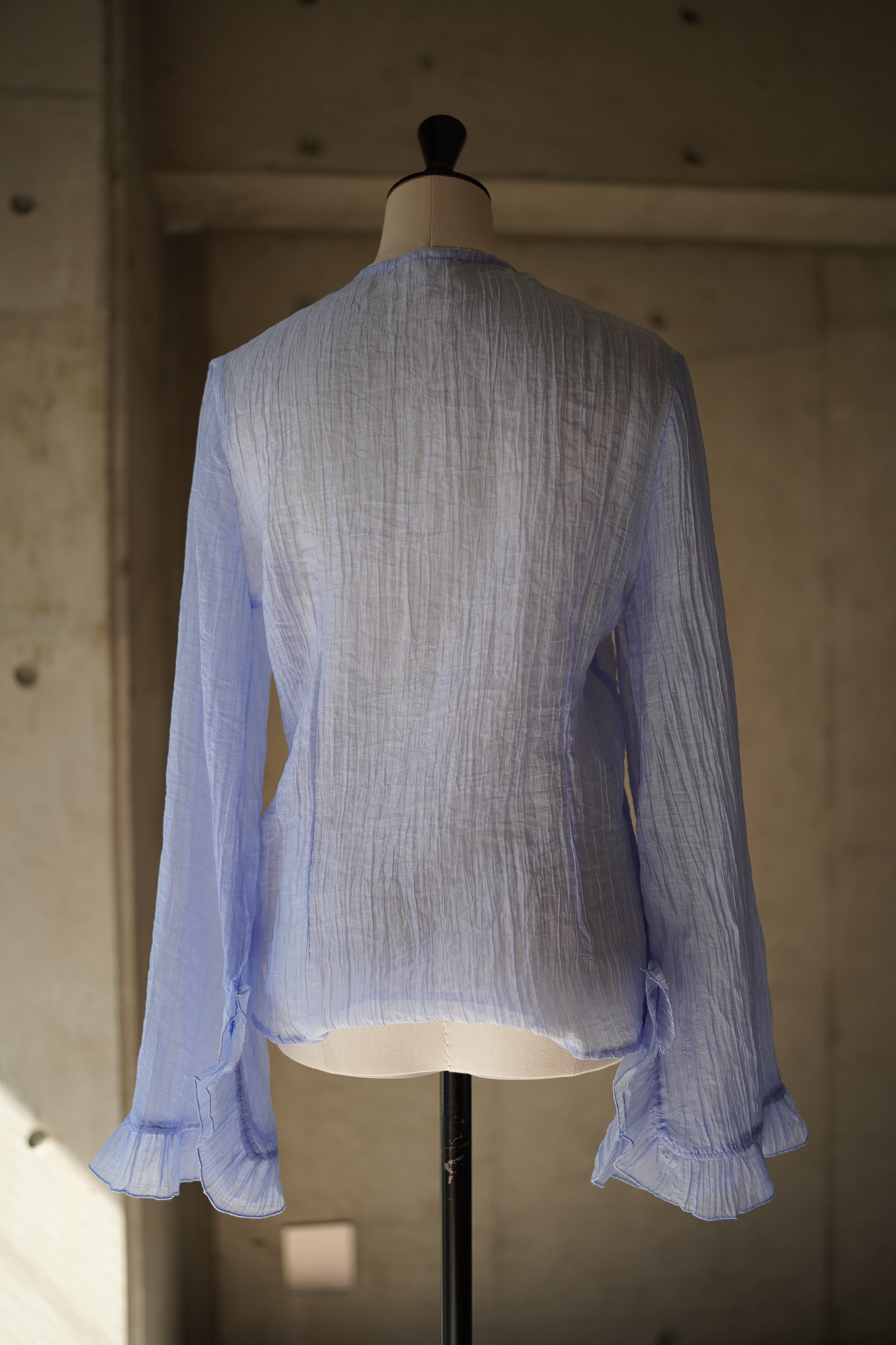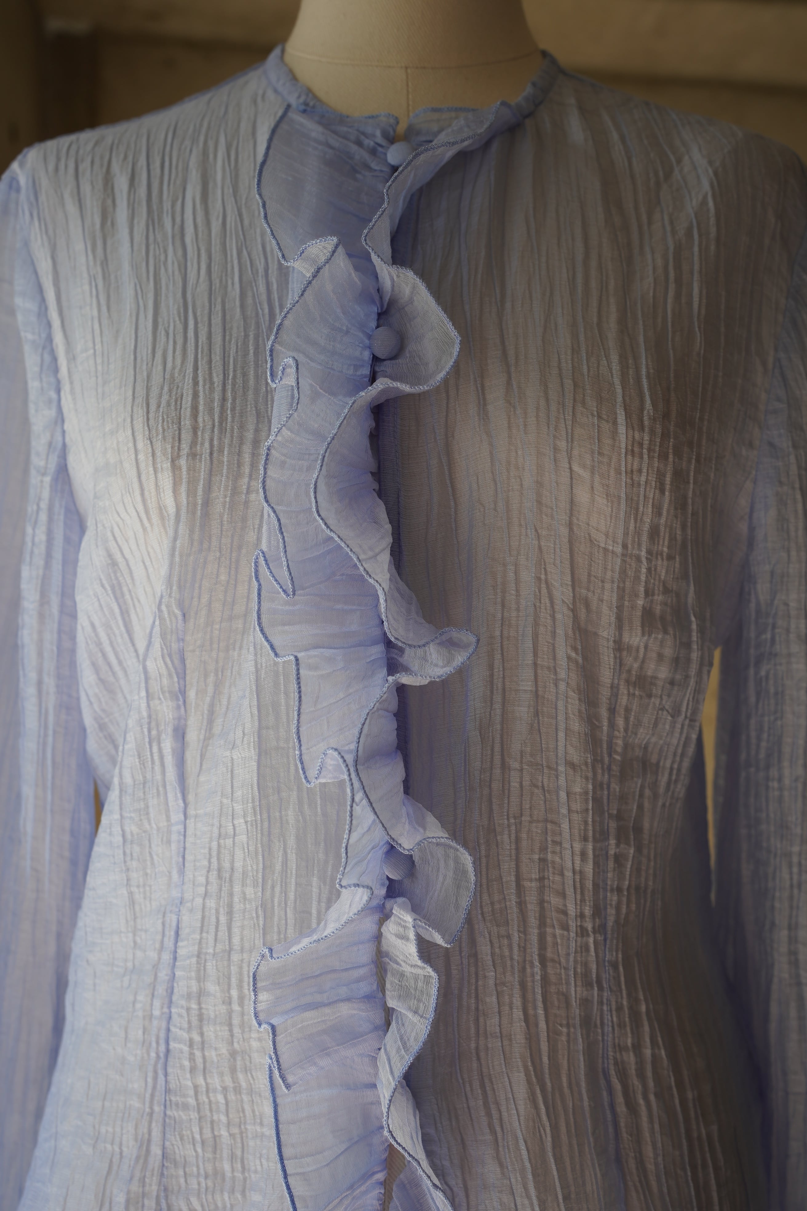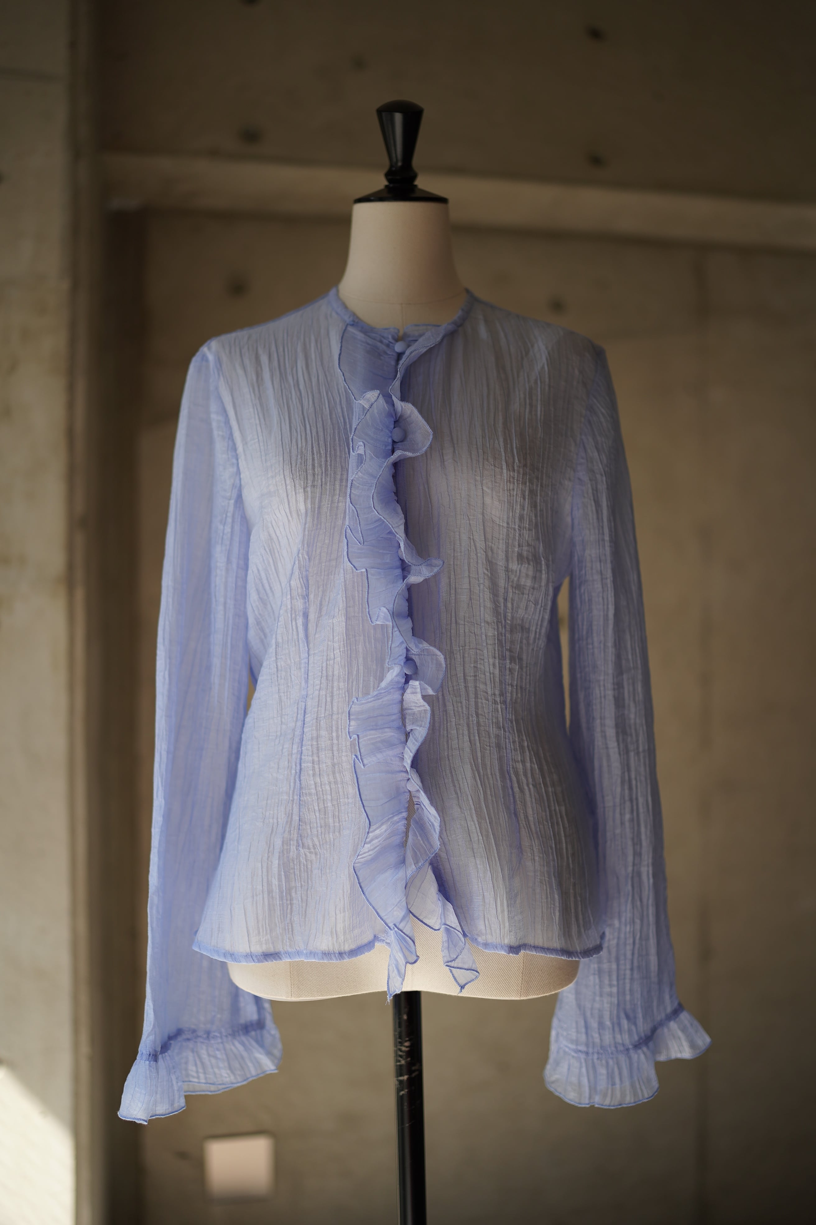 ドラマチックなフリルと、主張しすぎないくるみボタンが魅力のロングスリーブ。