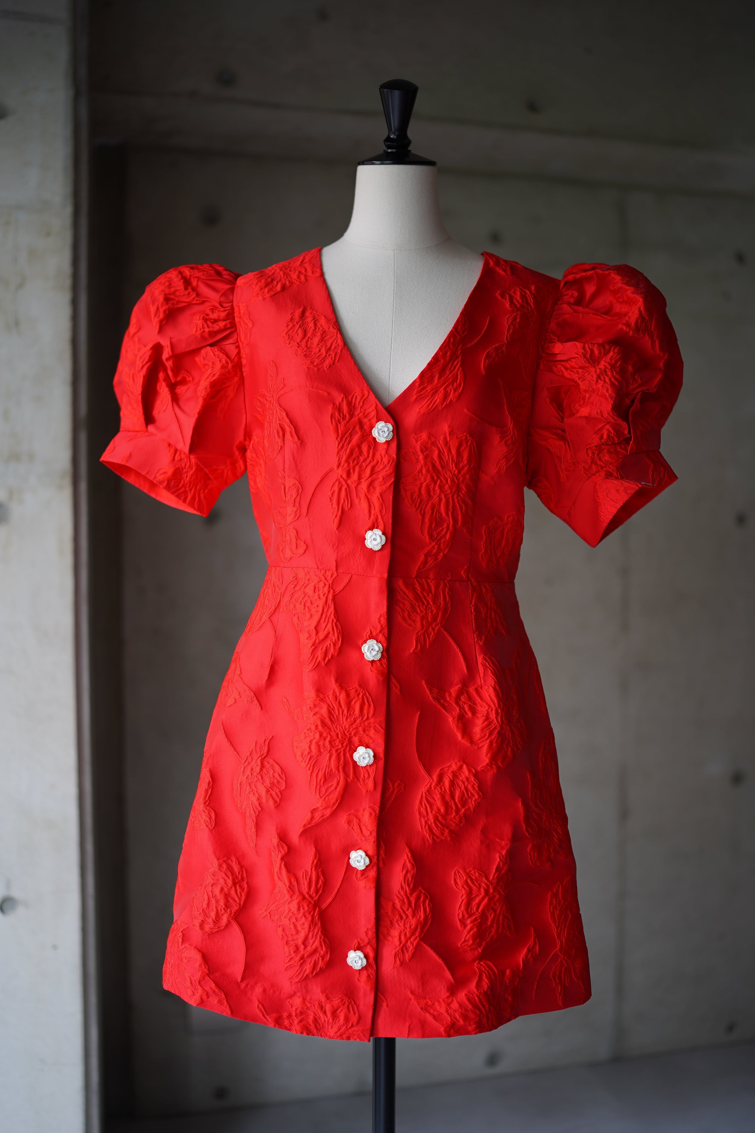 鮮やかな赤が目を惹くジャガードドレス。