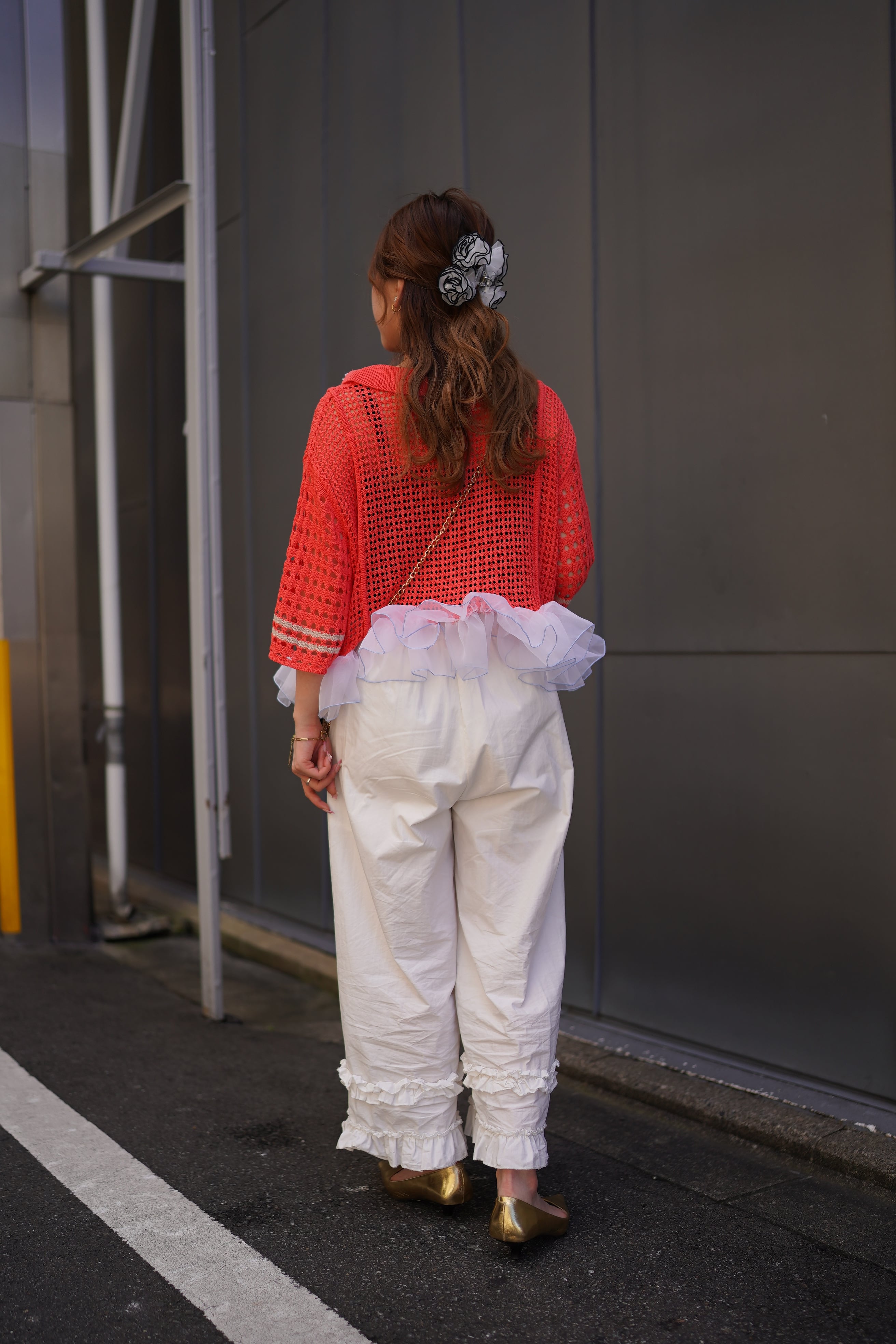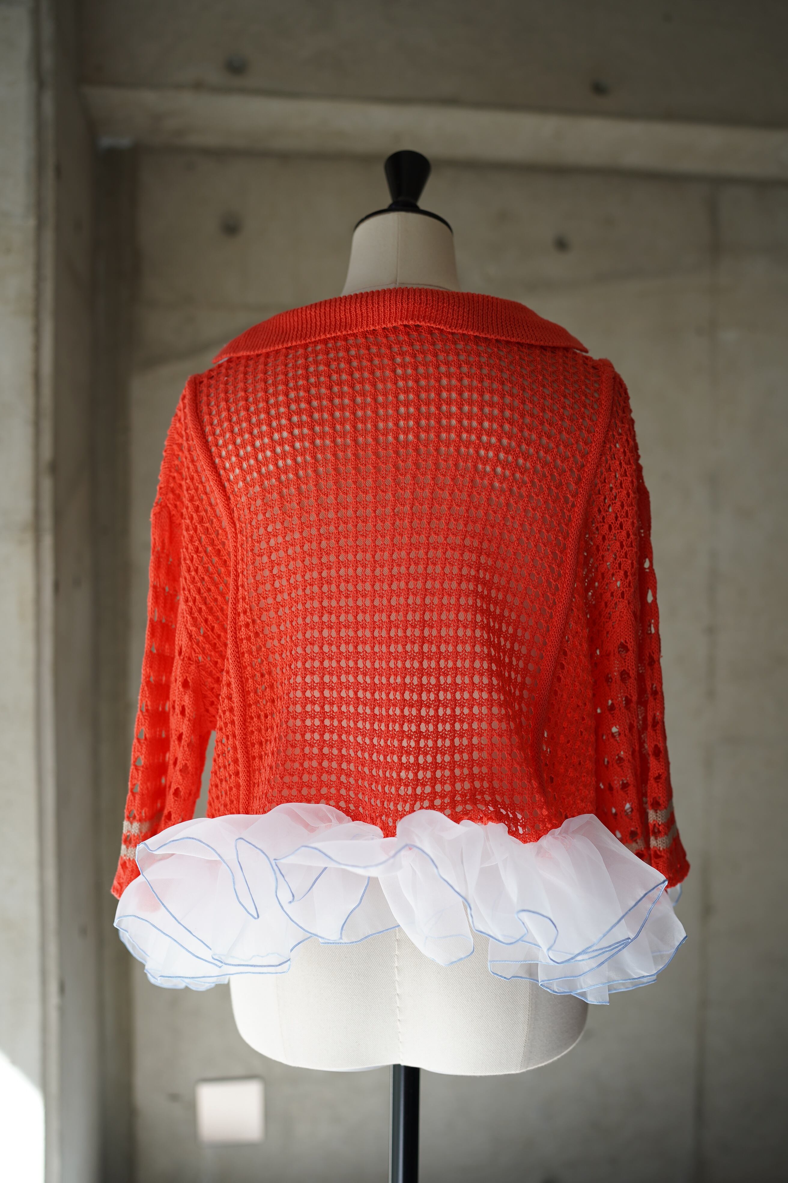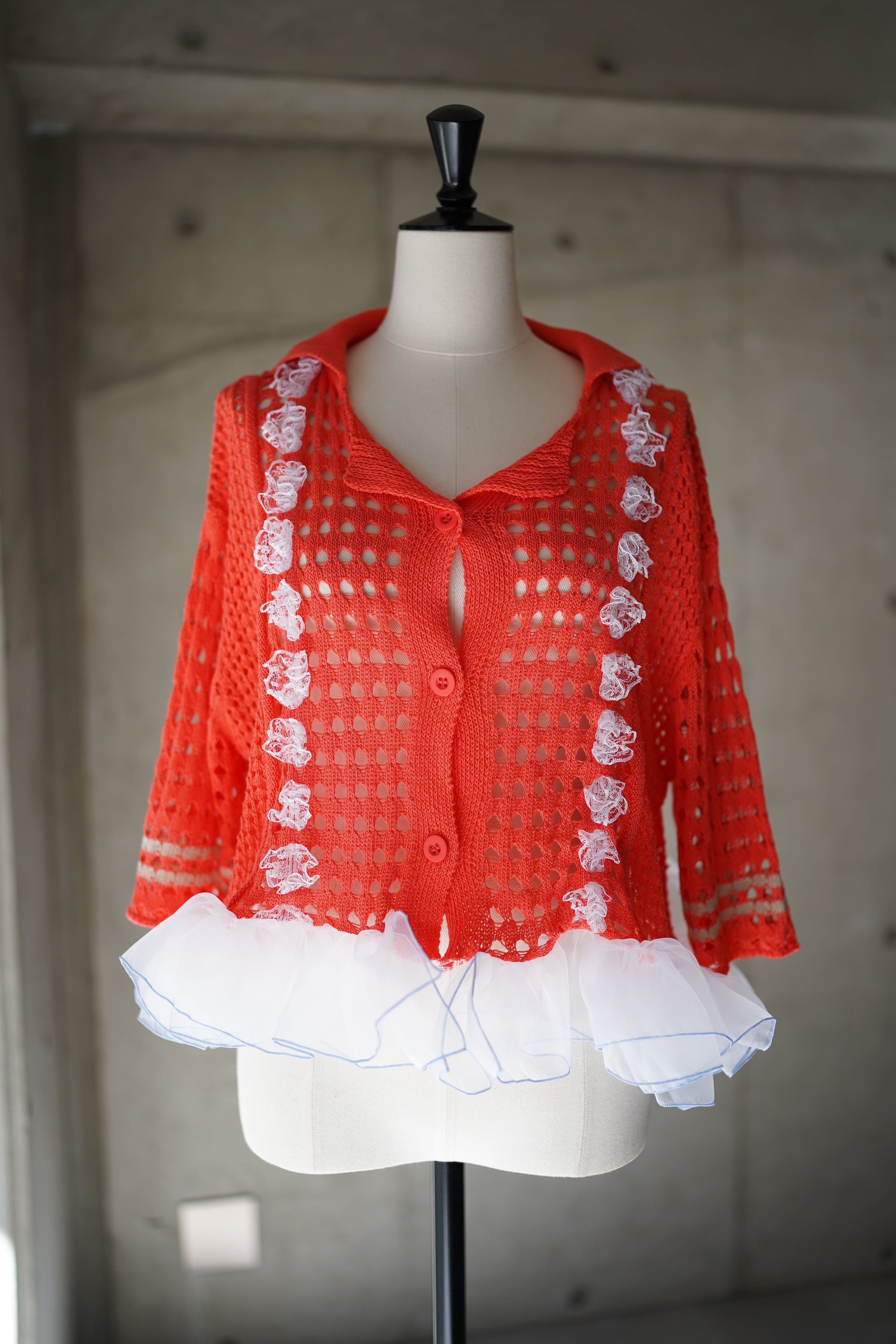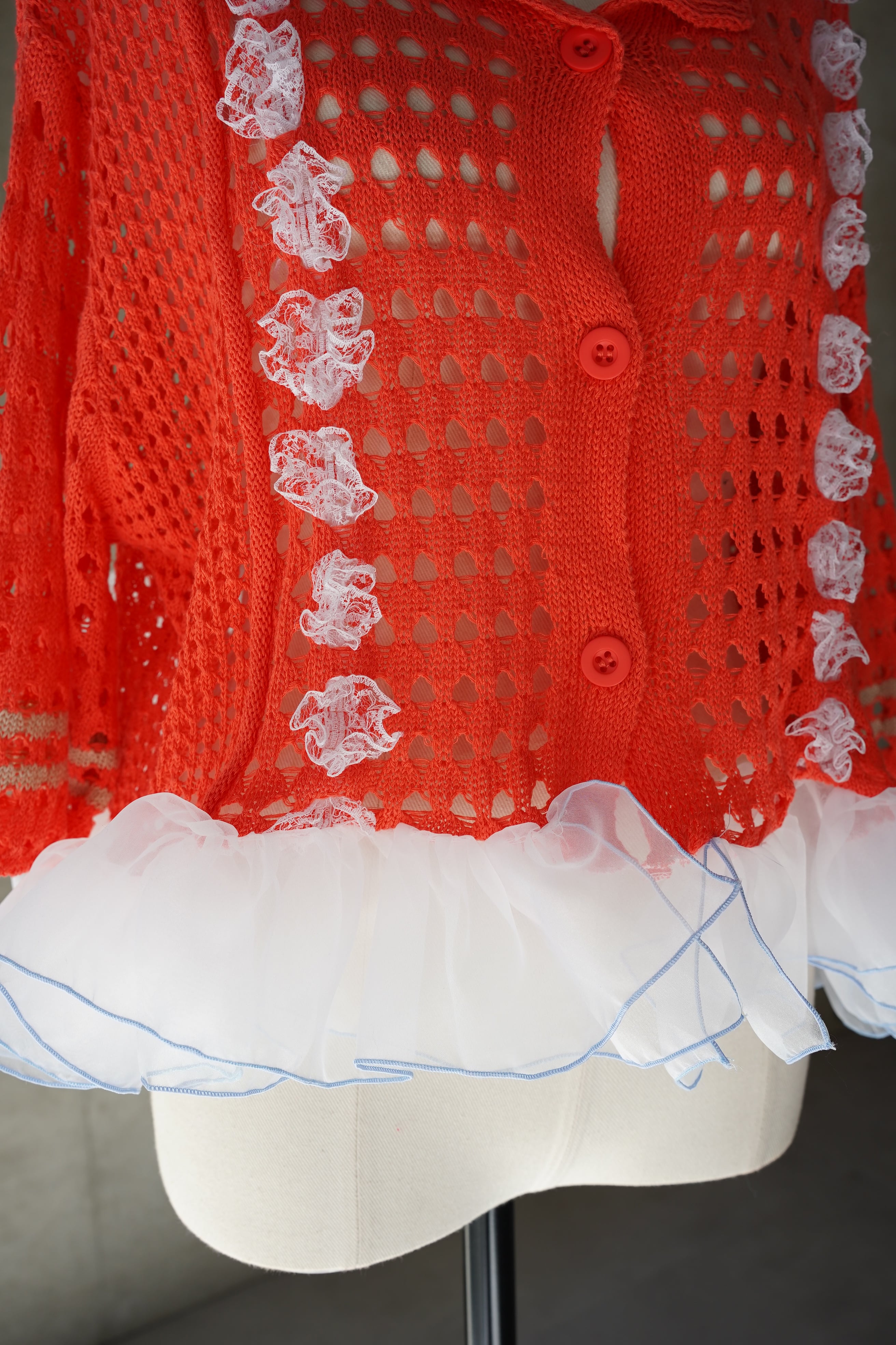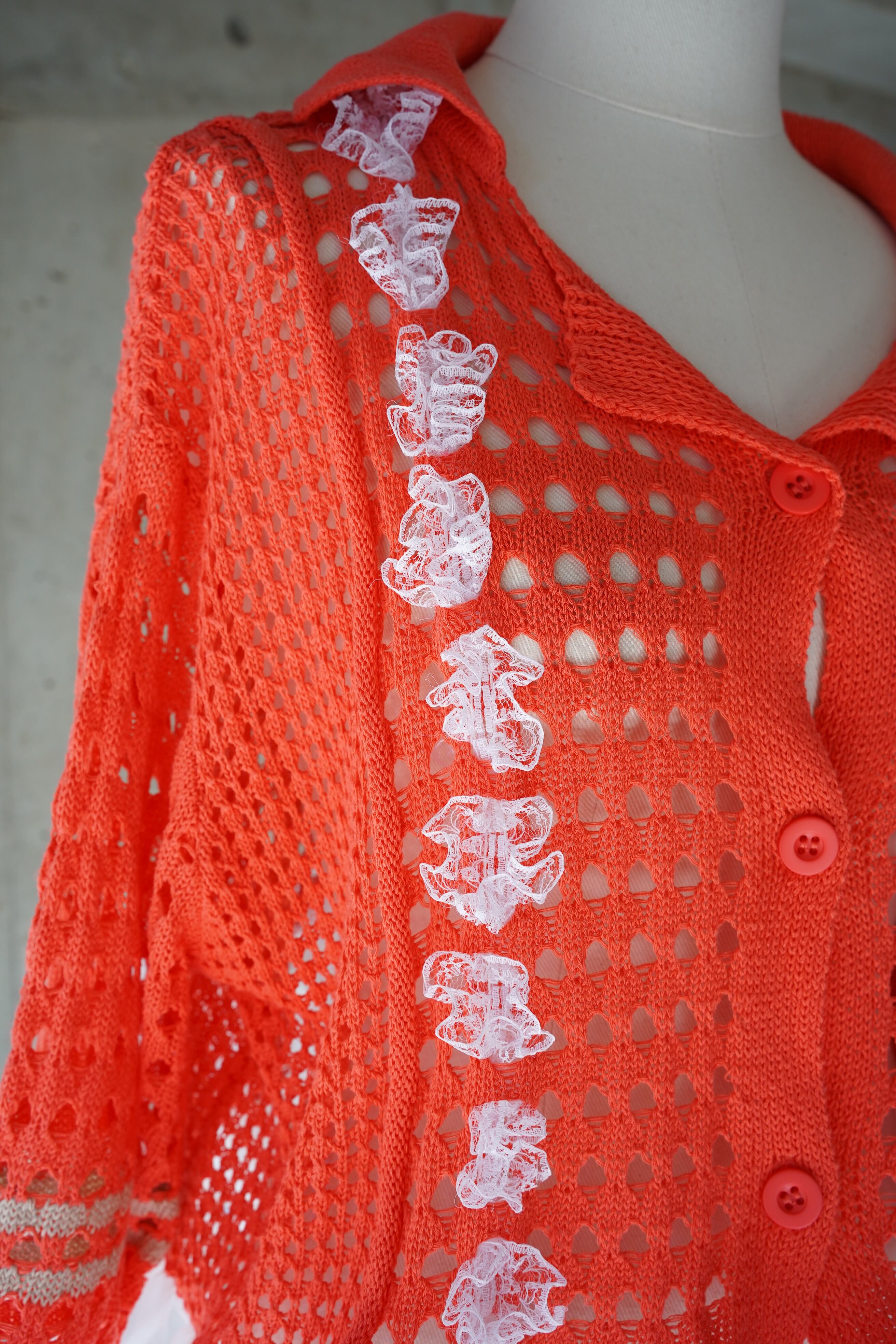 サーモンピンクのカーディガンにフリルがあしらわれた一品。