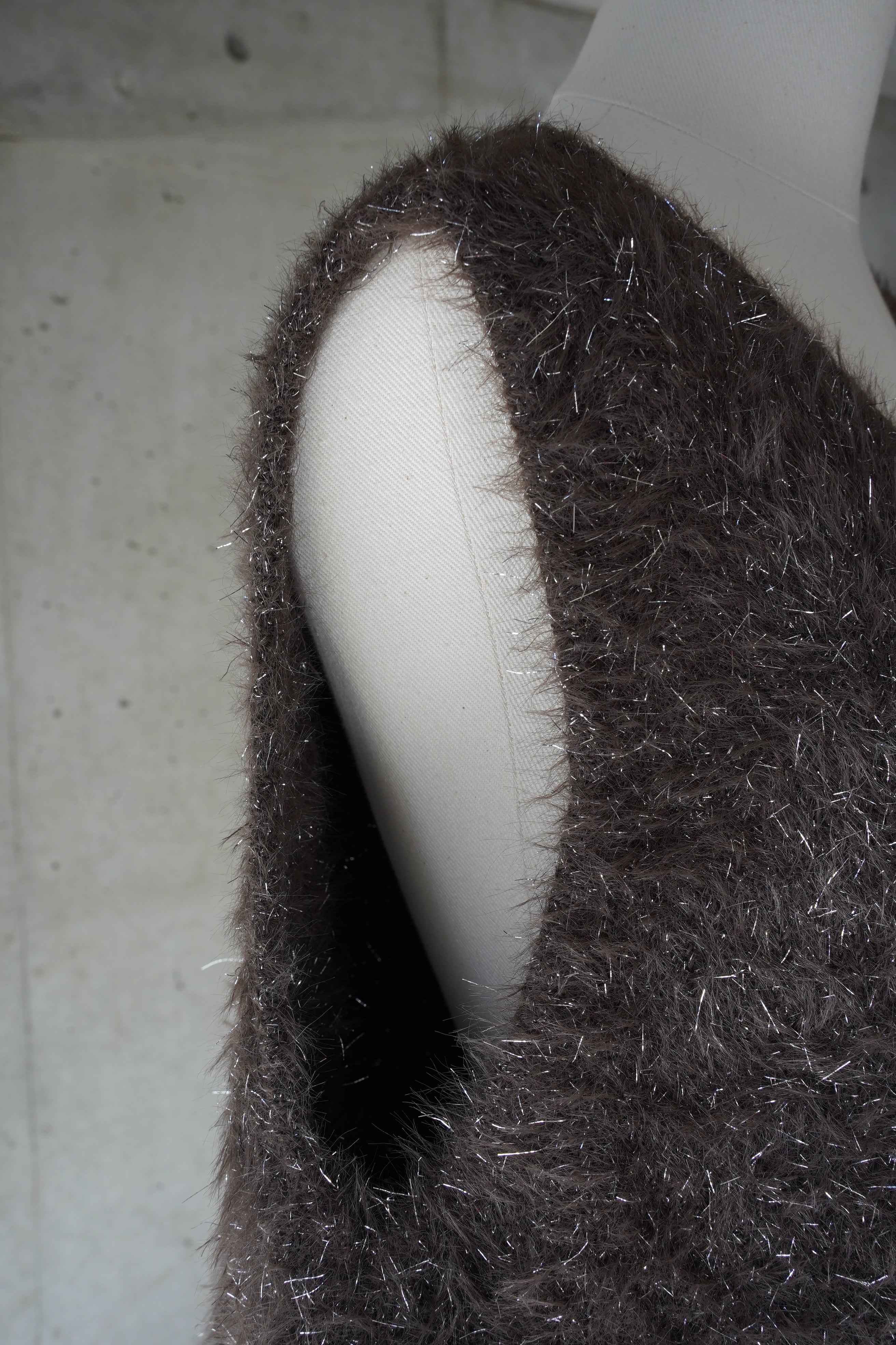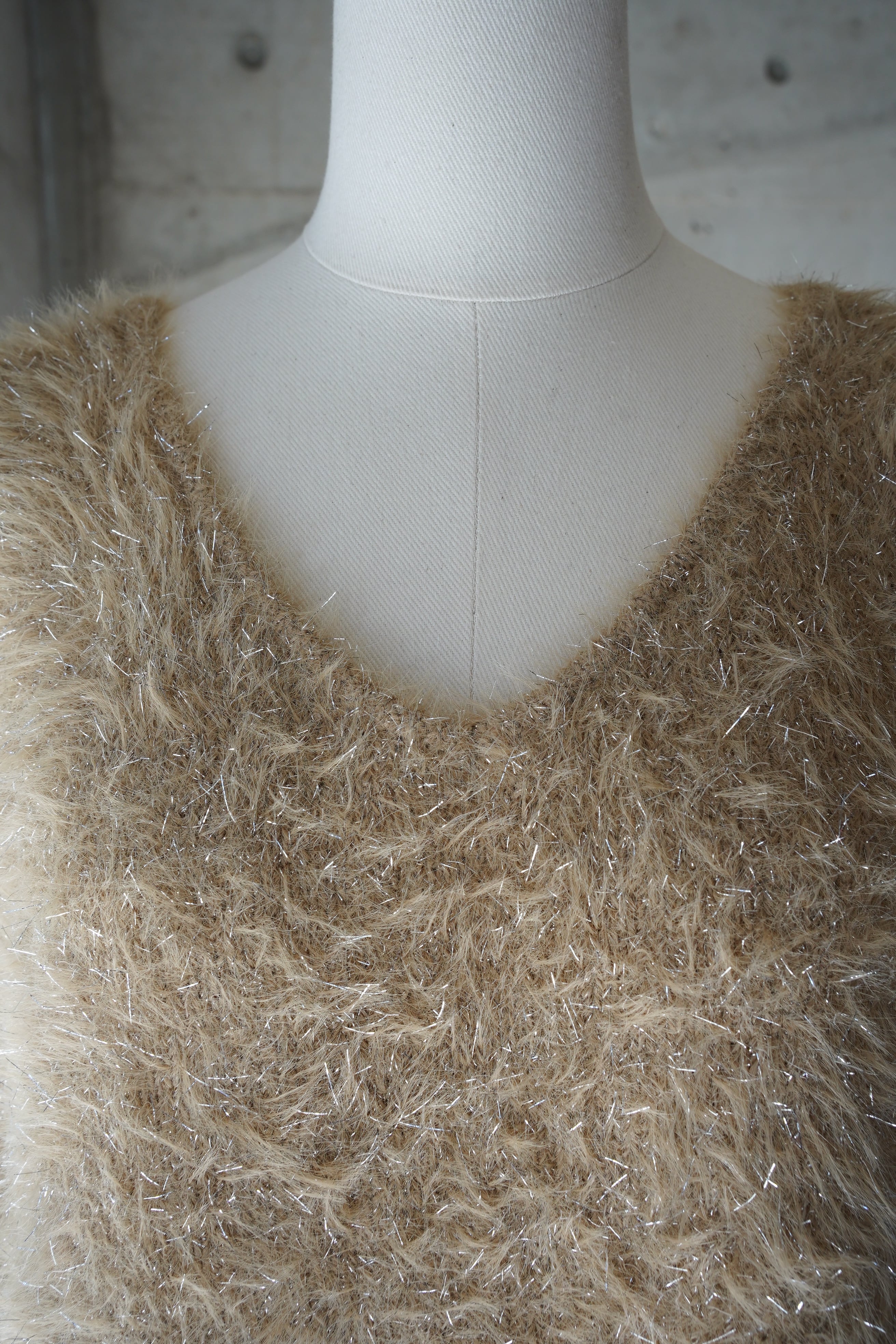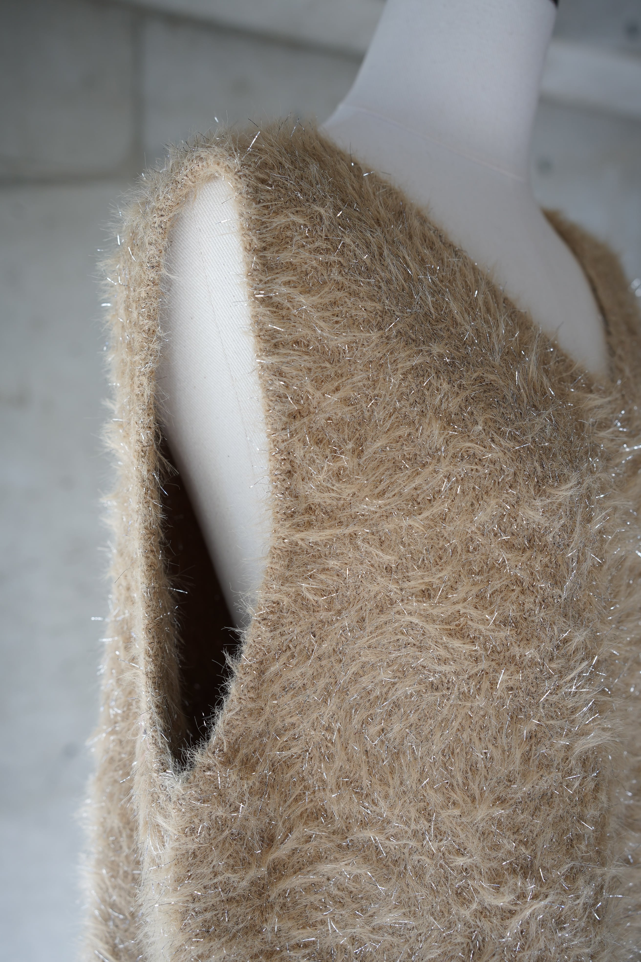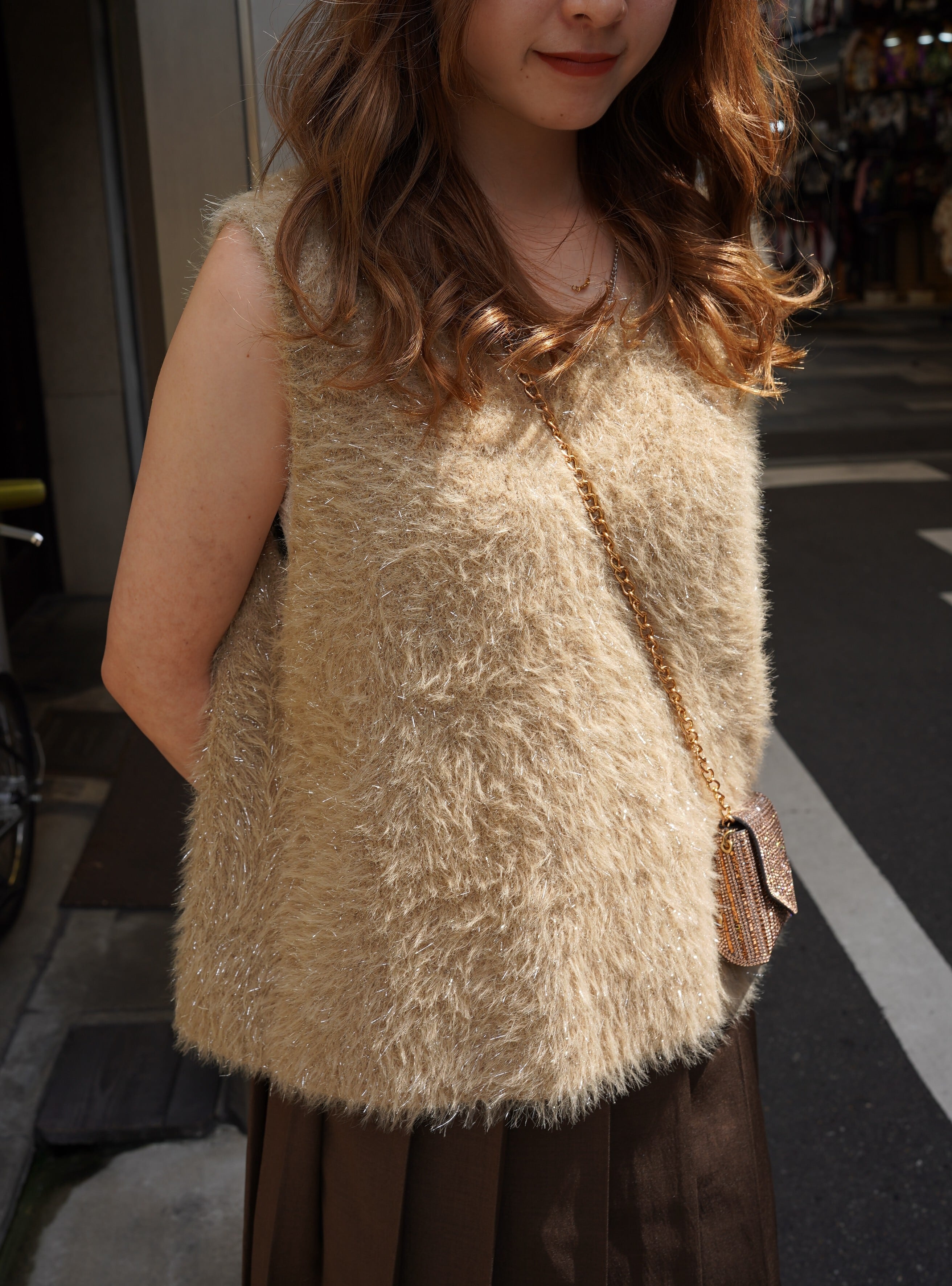 毛足の長いシャギーにラメ糸をミックスした質感のニットベスト。