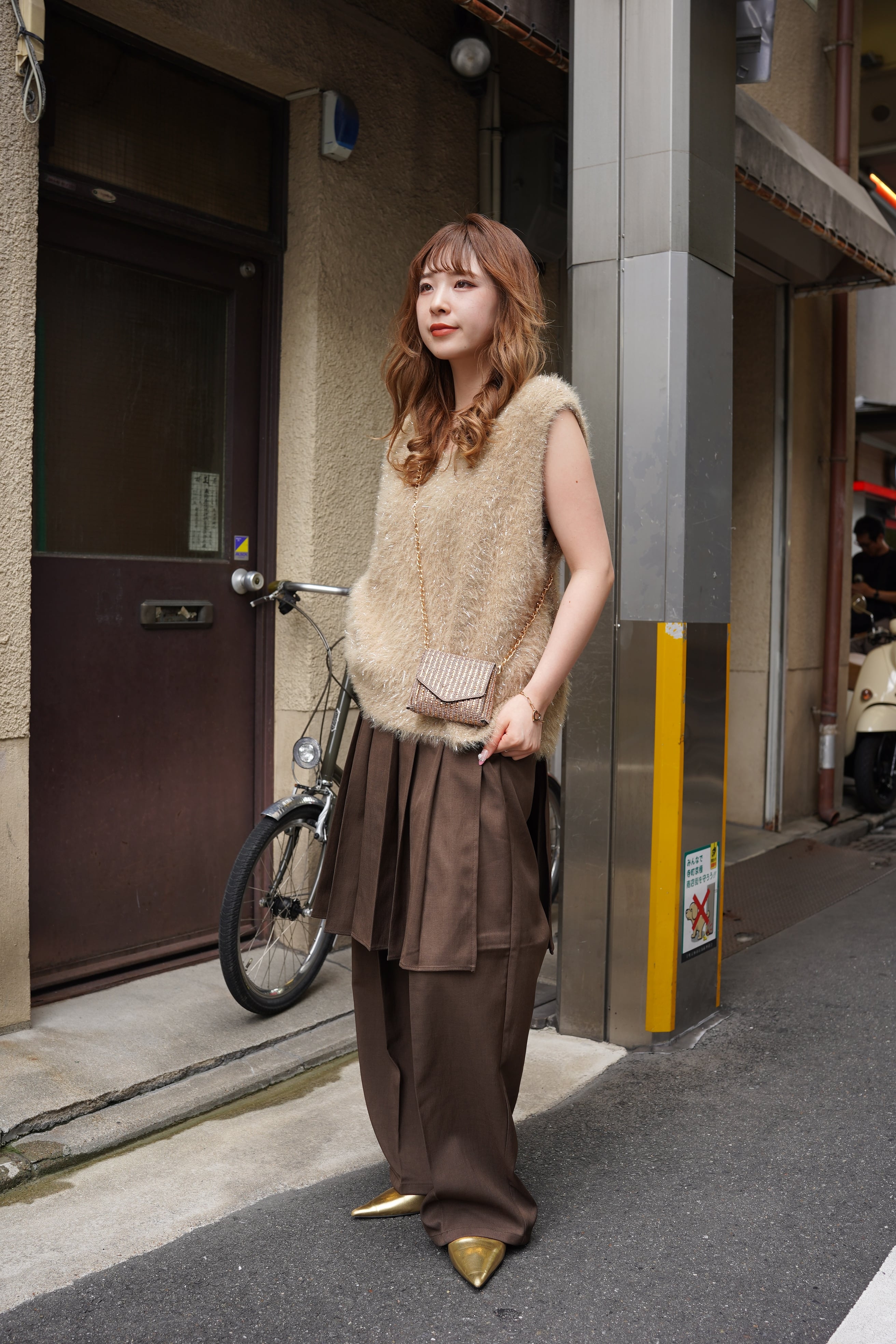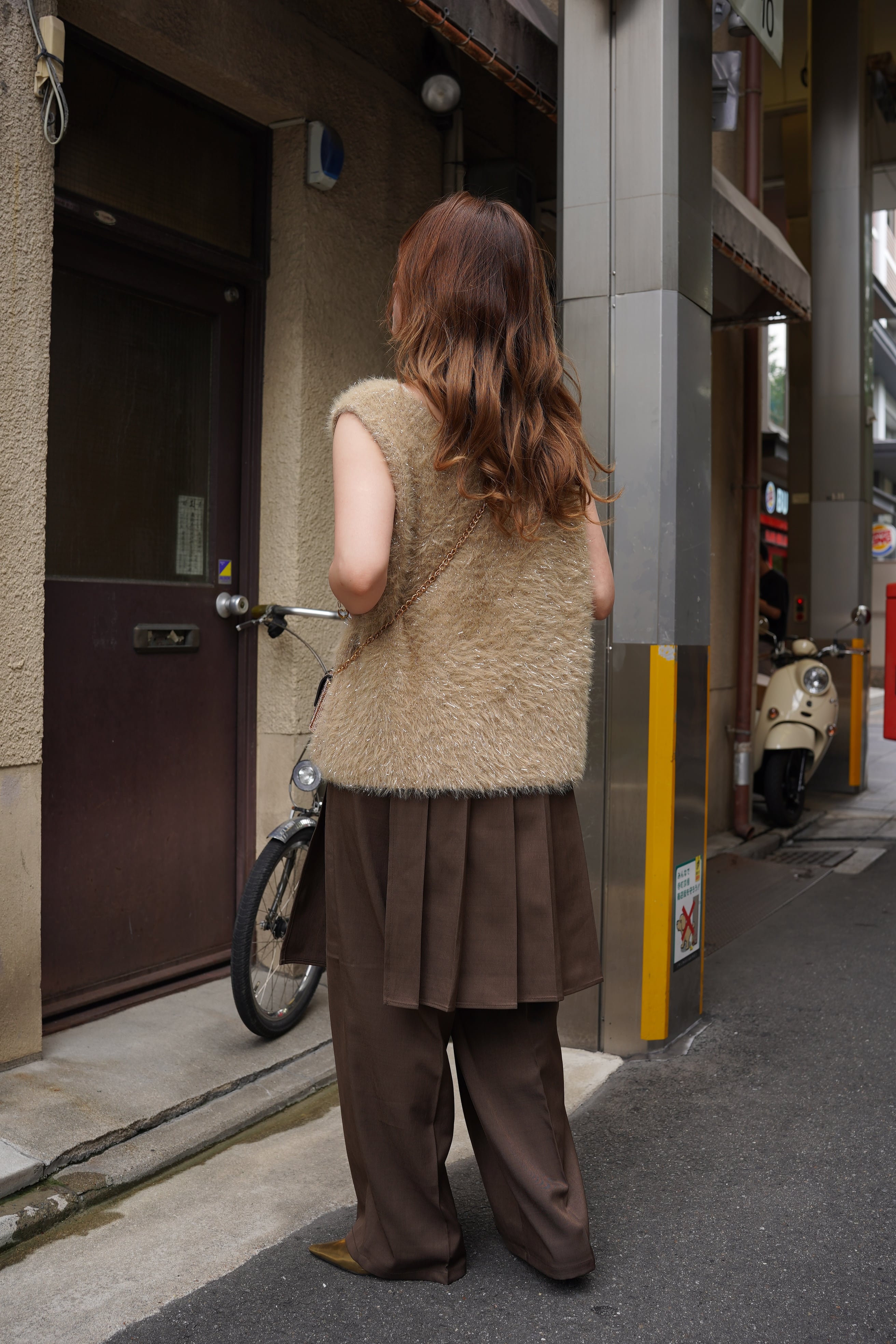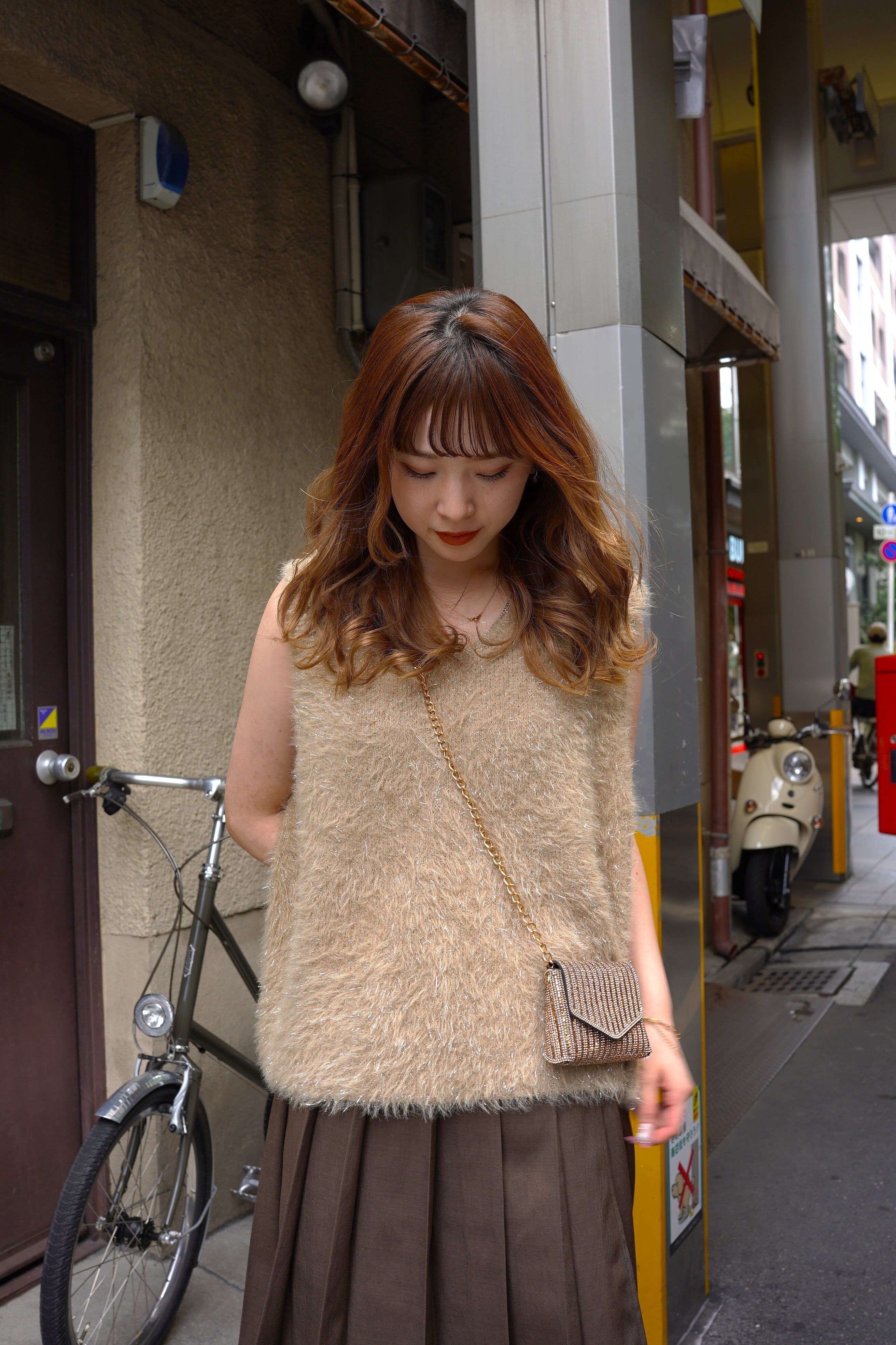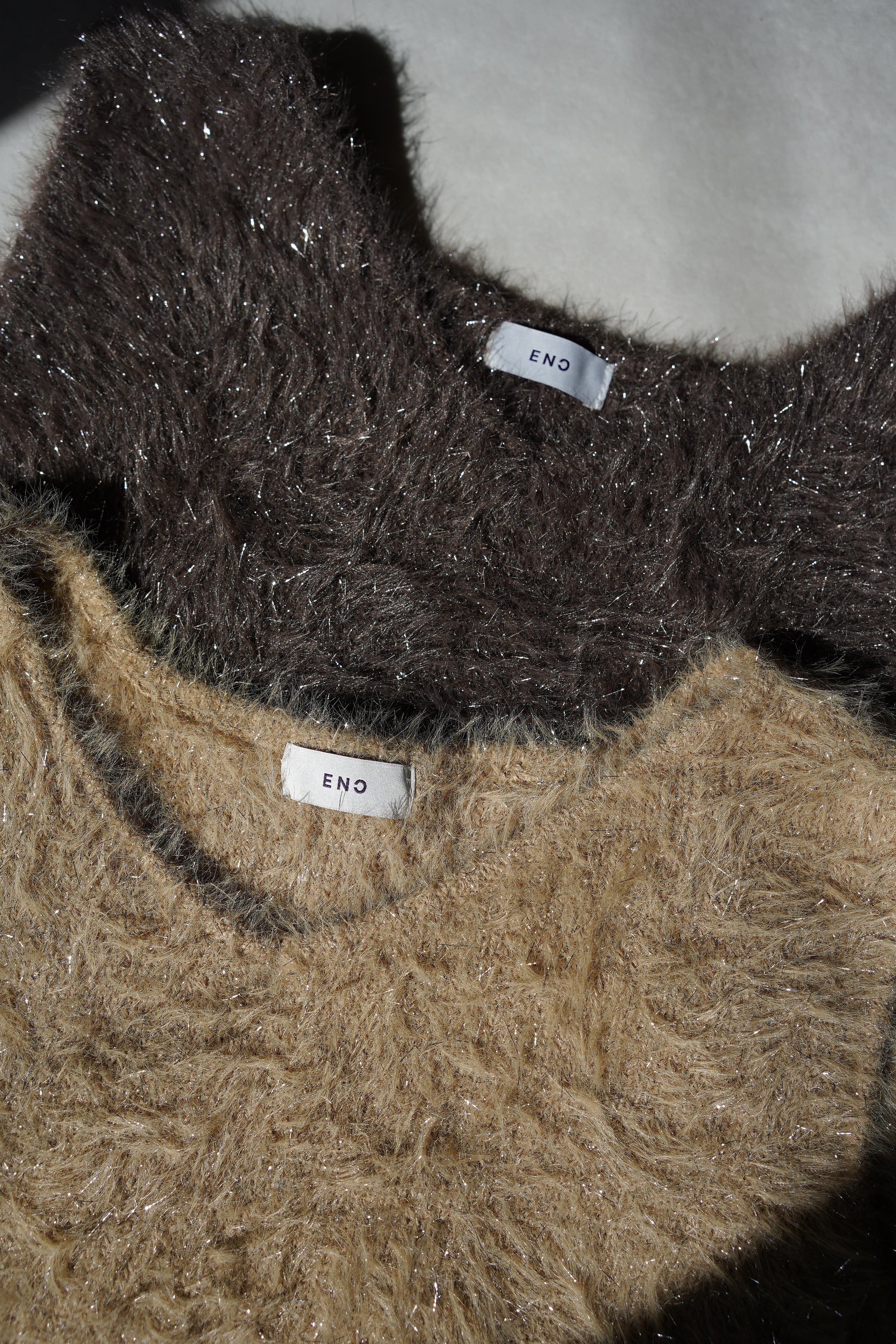 毛足の長いシャギーにラメ糸をミックスした質感のニットベスト。