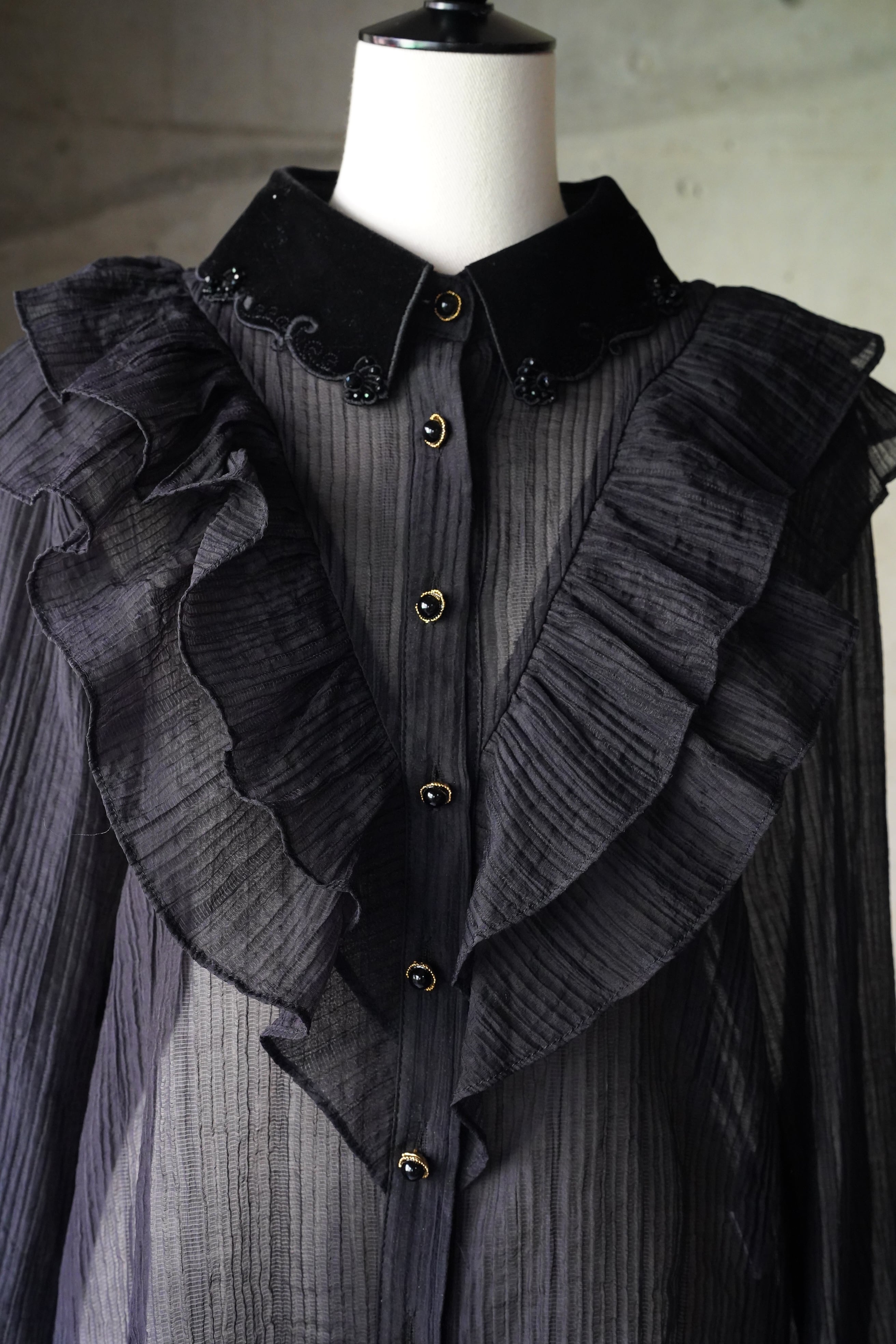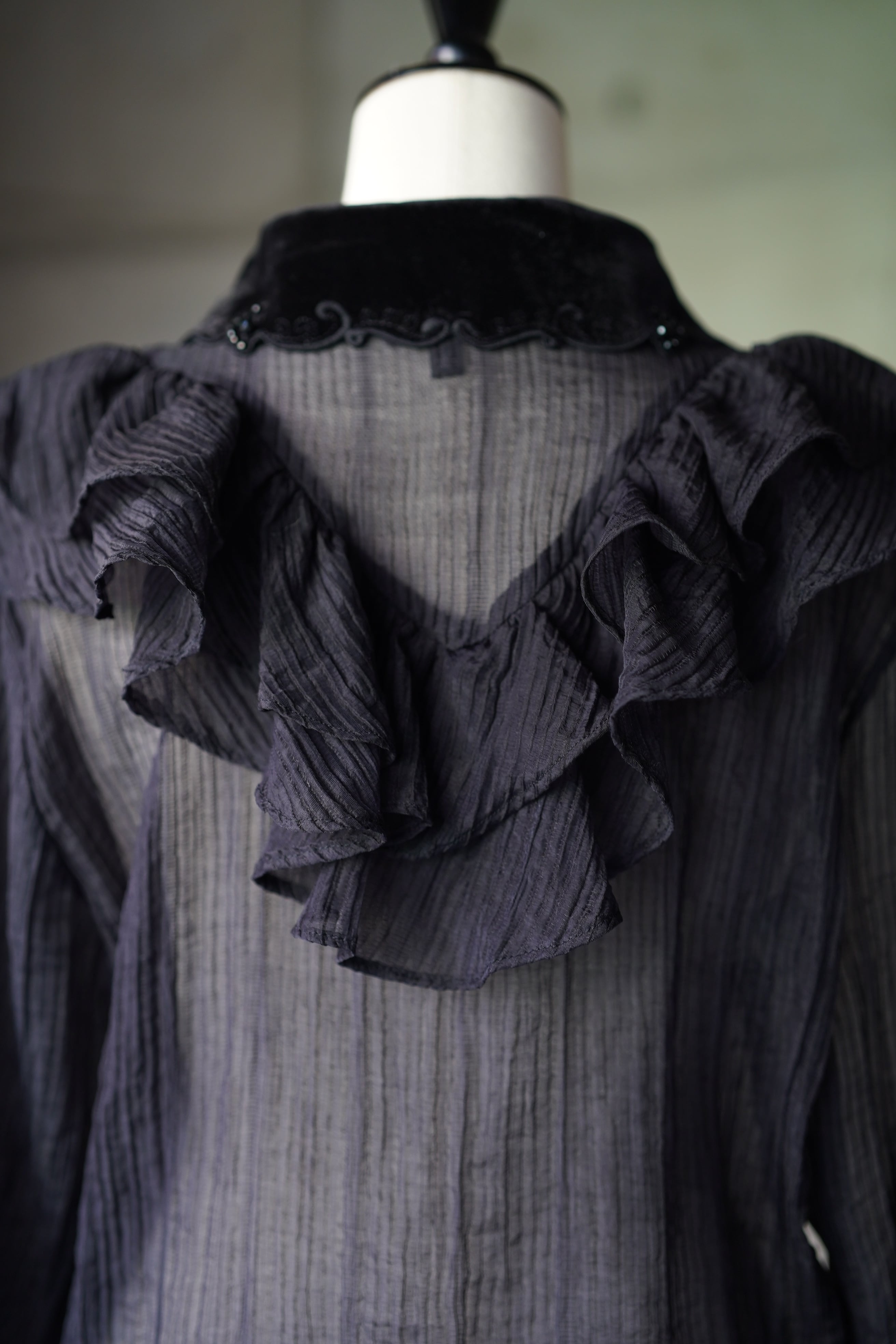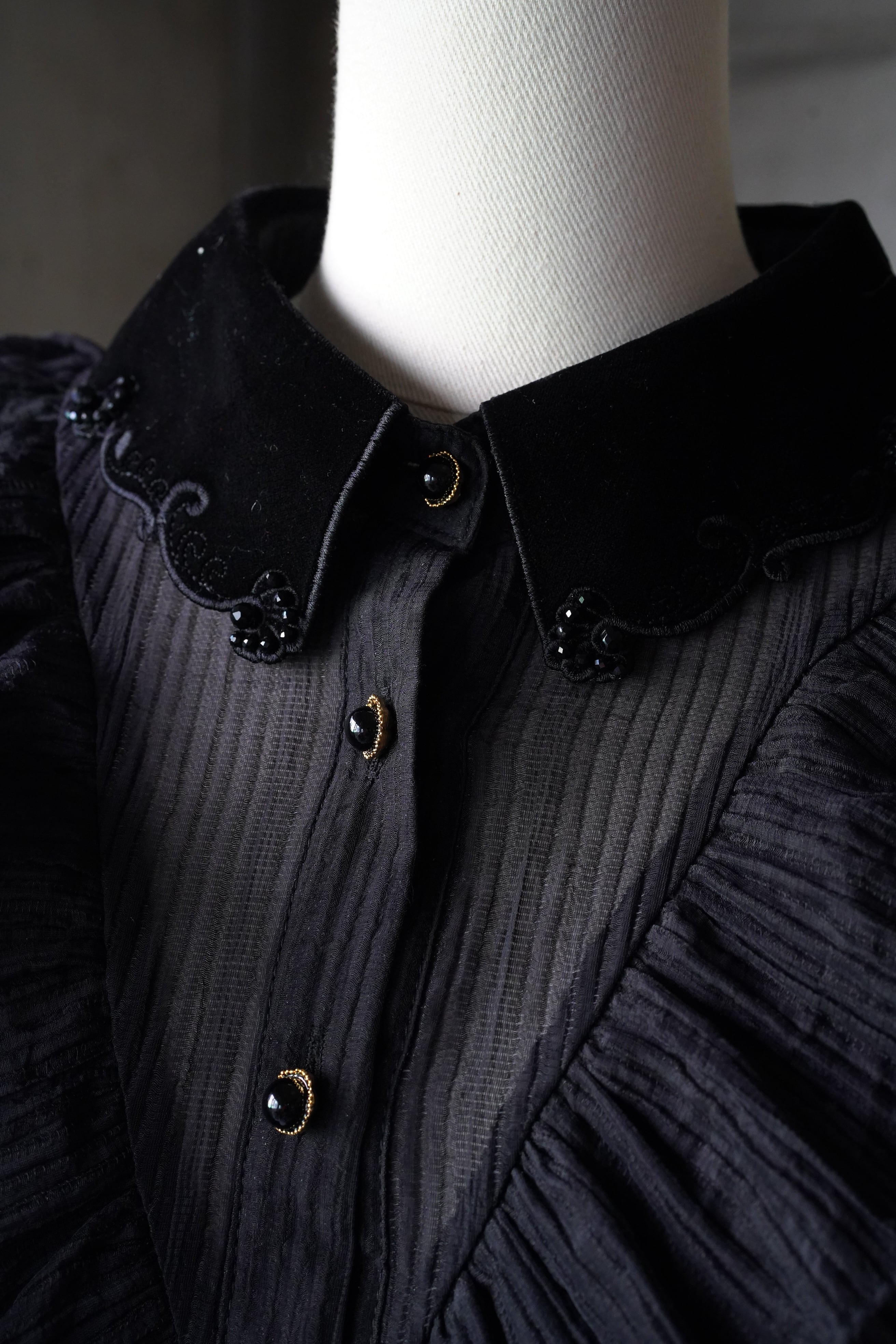 ベルベットの襟元には輝く装飾が施され、幻想的な可愛らしさと