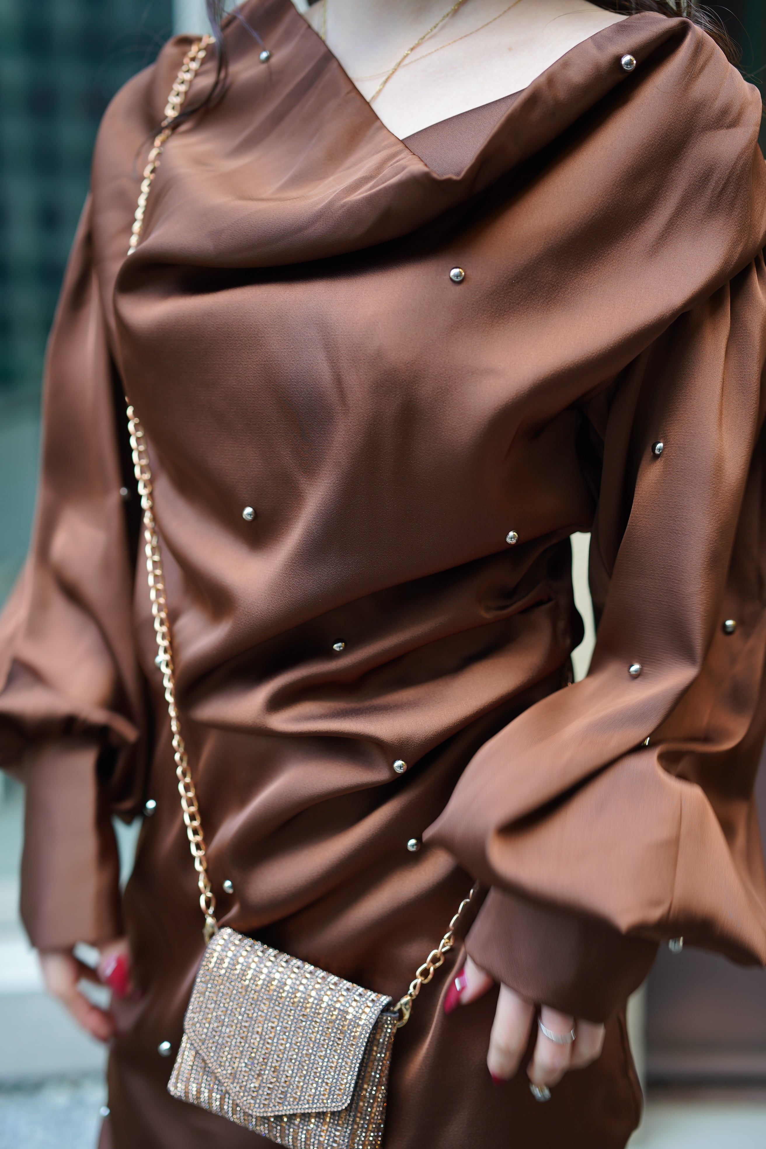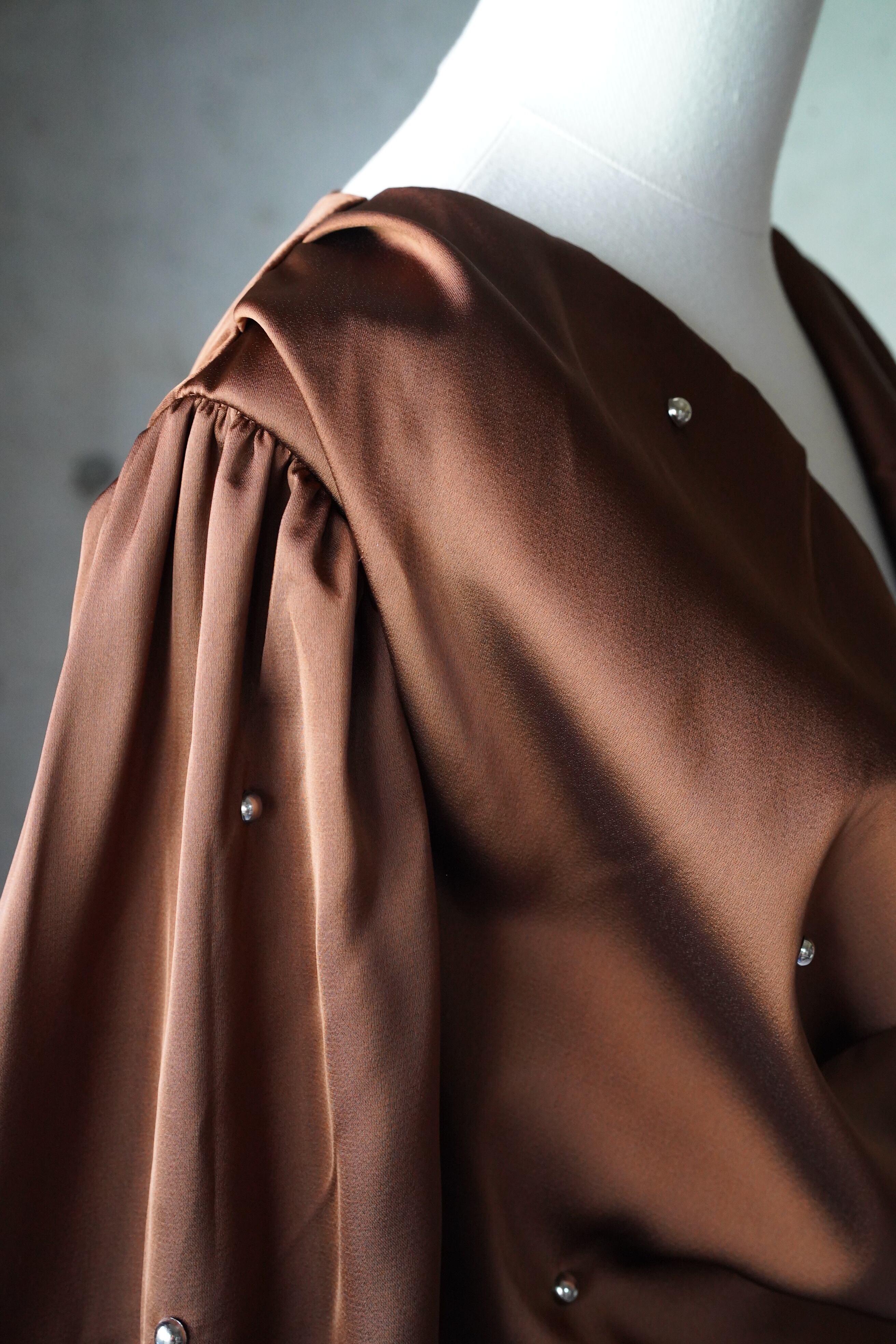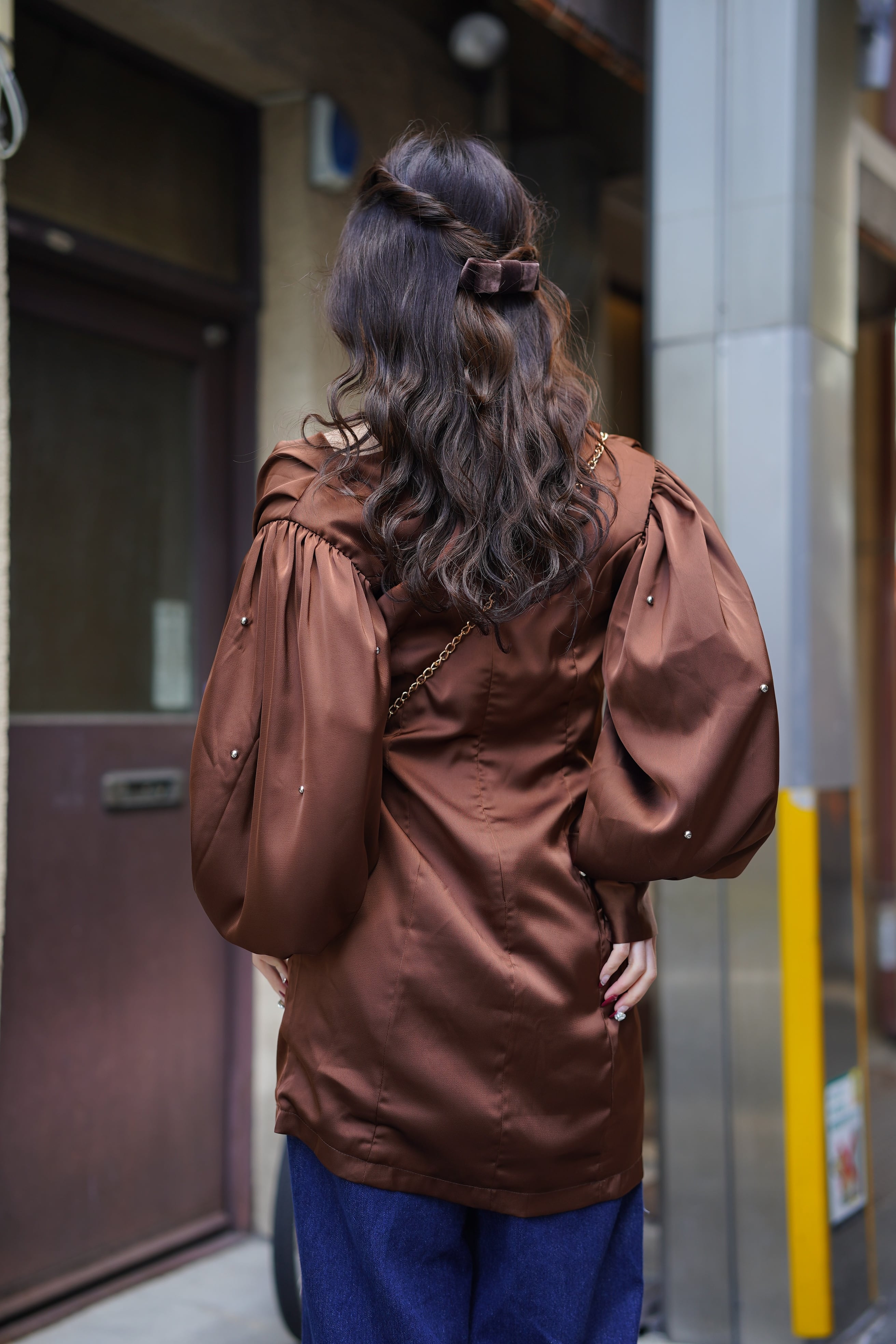 リッチなブラウンのサテンにシルバースタッズが合わさり、