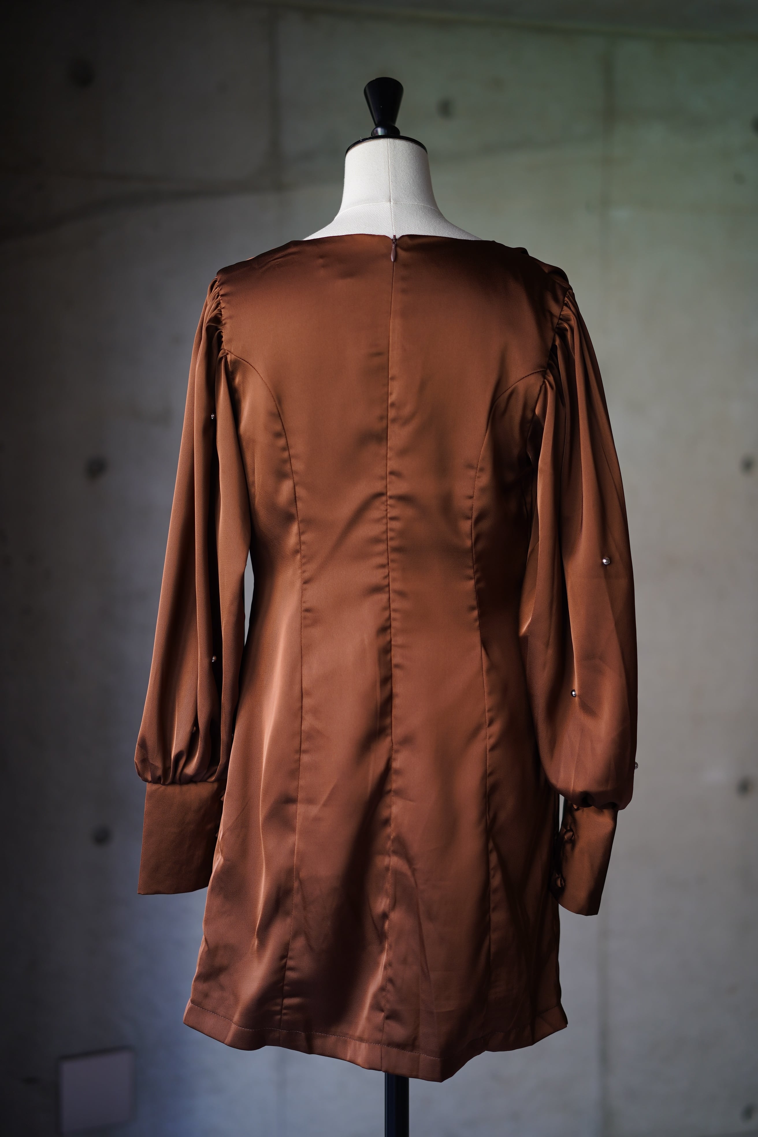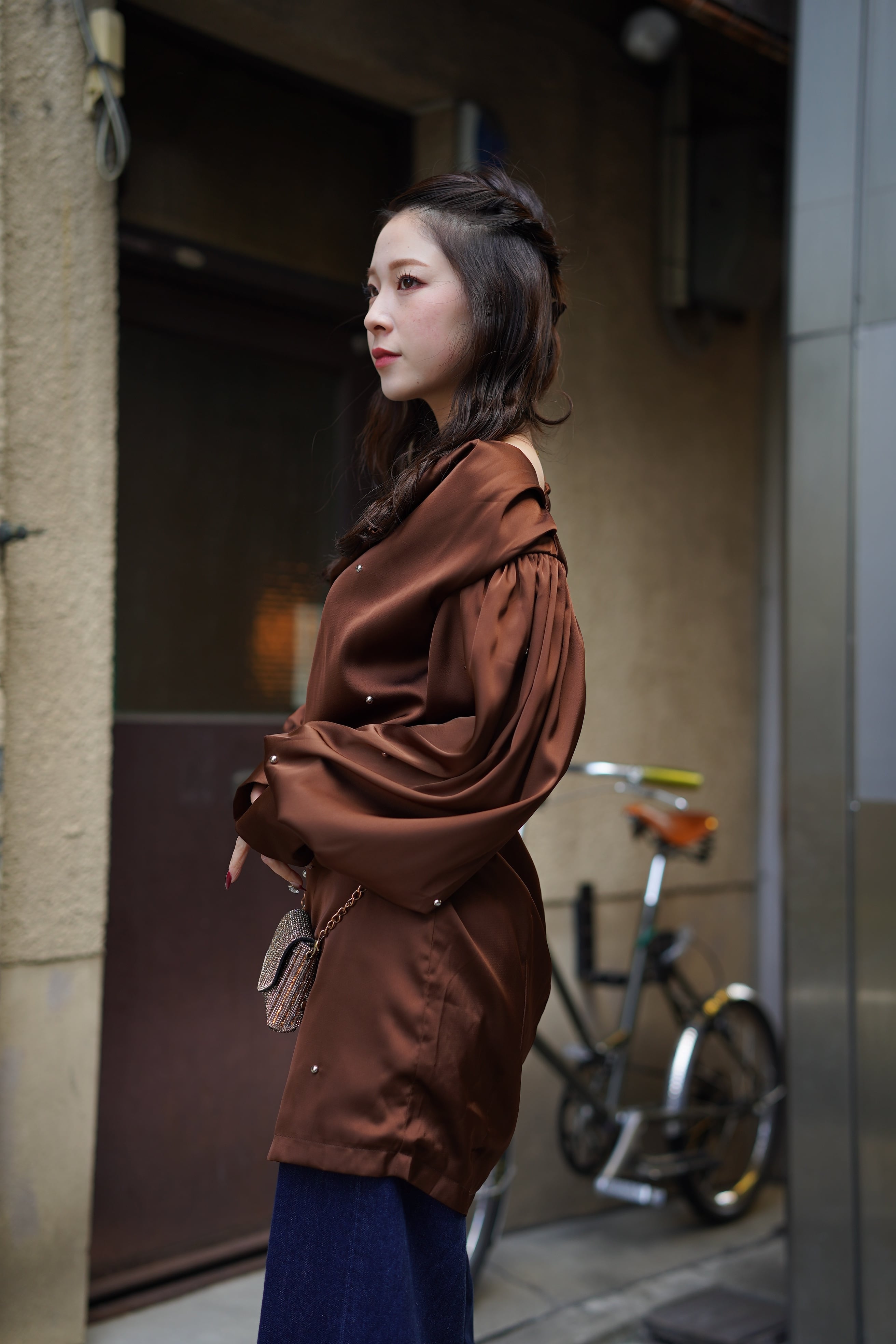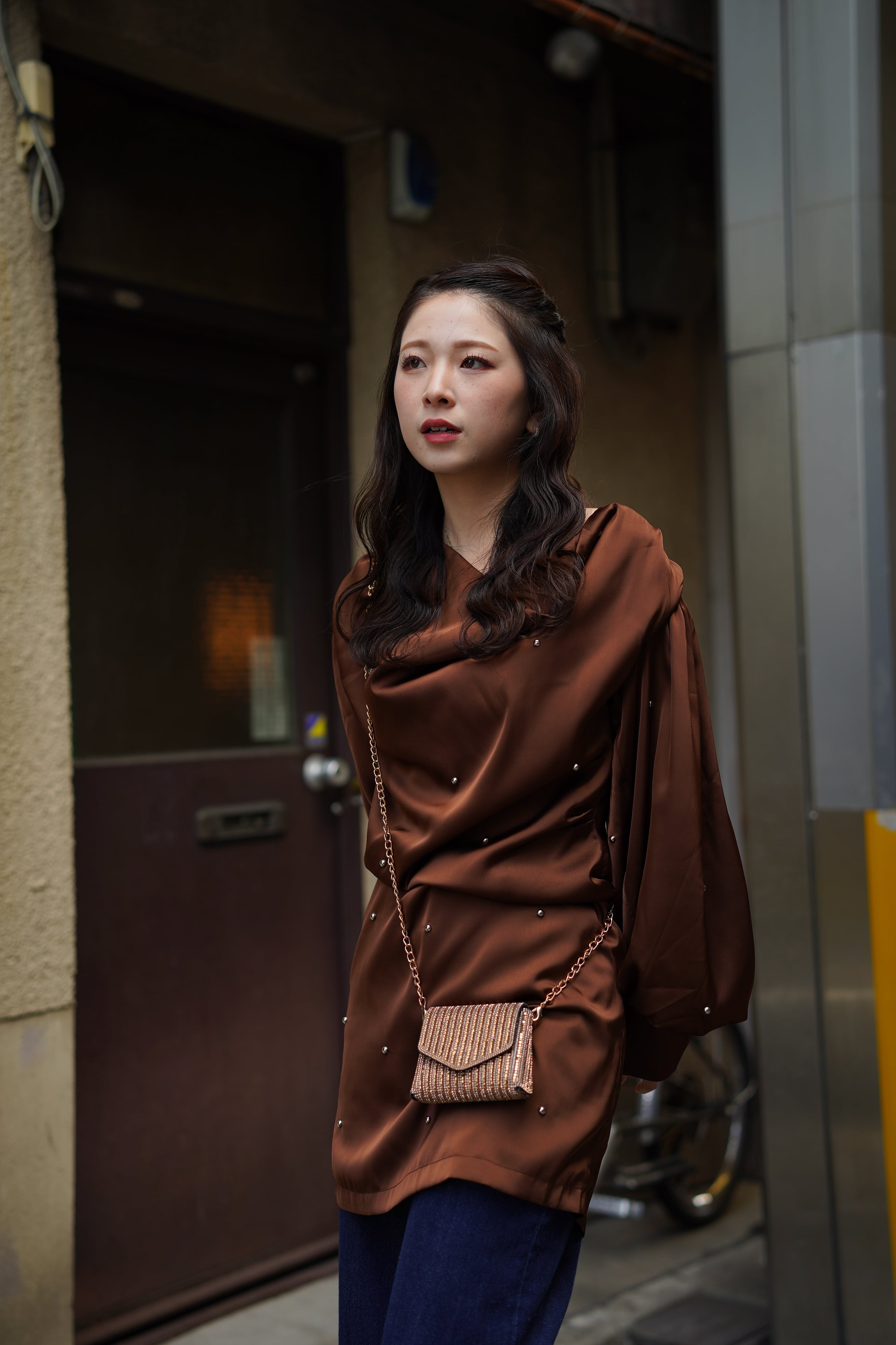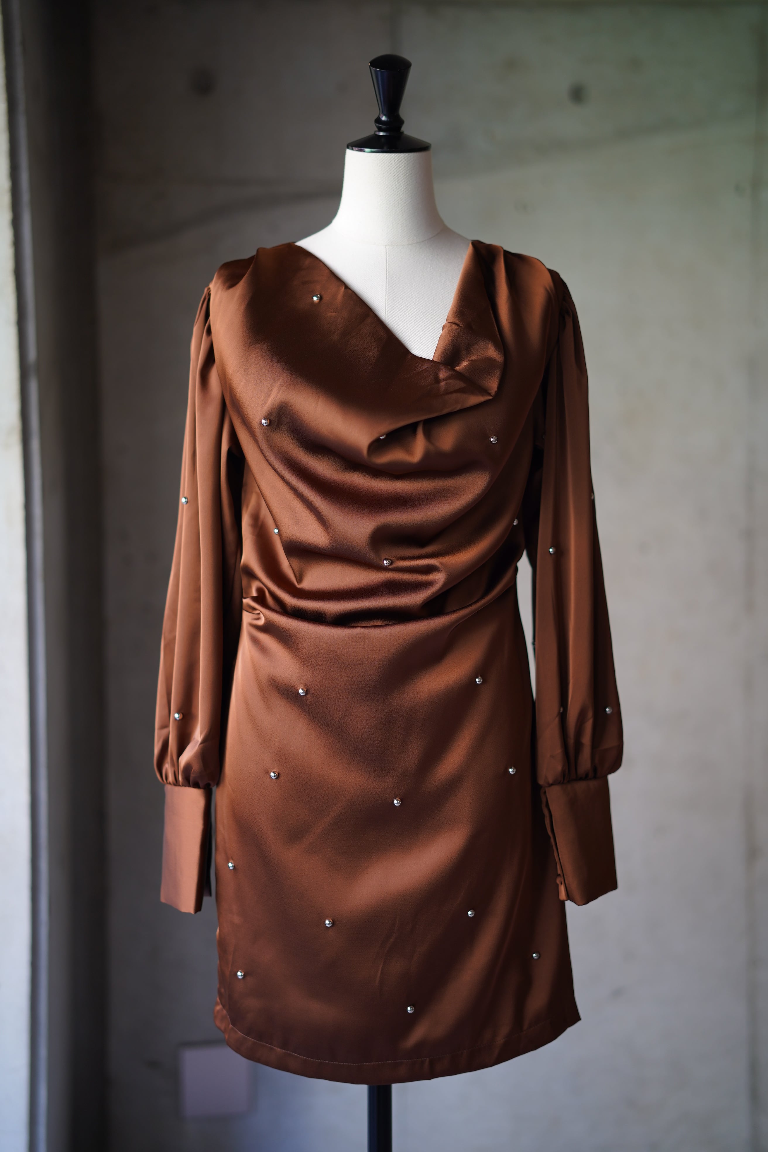 リッチなブラウンのサテンにシルバースタッズが合わさり、