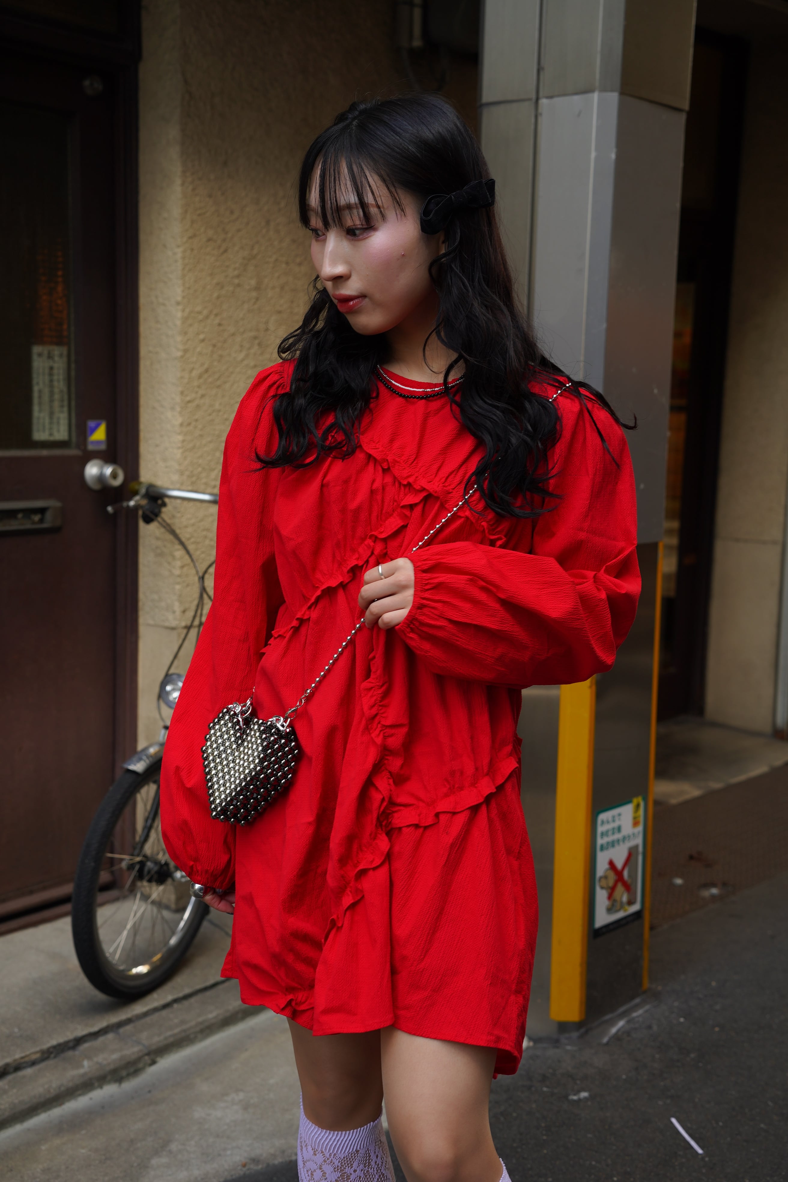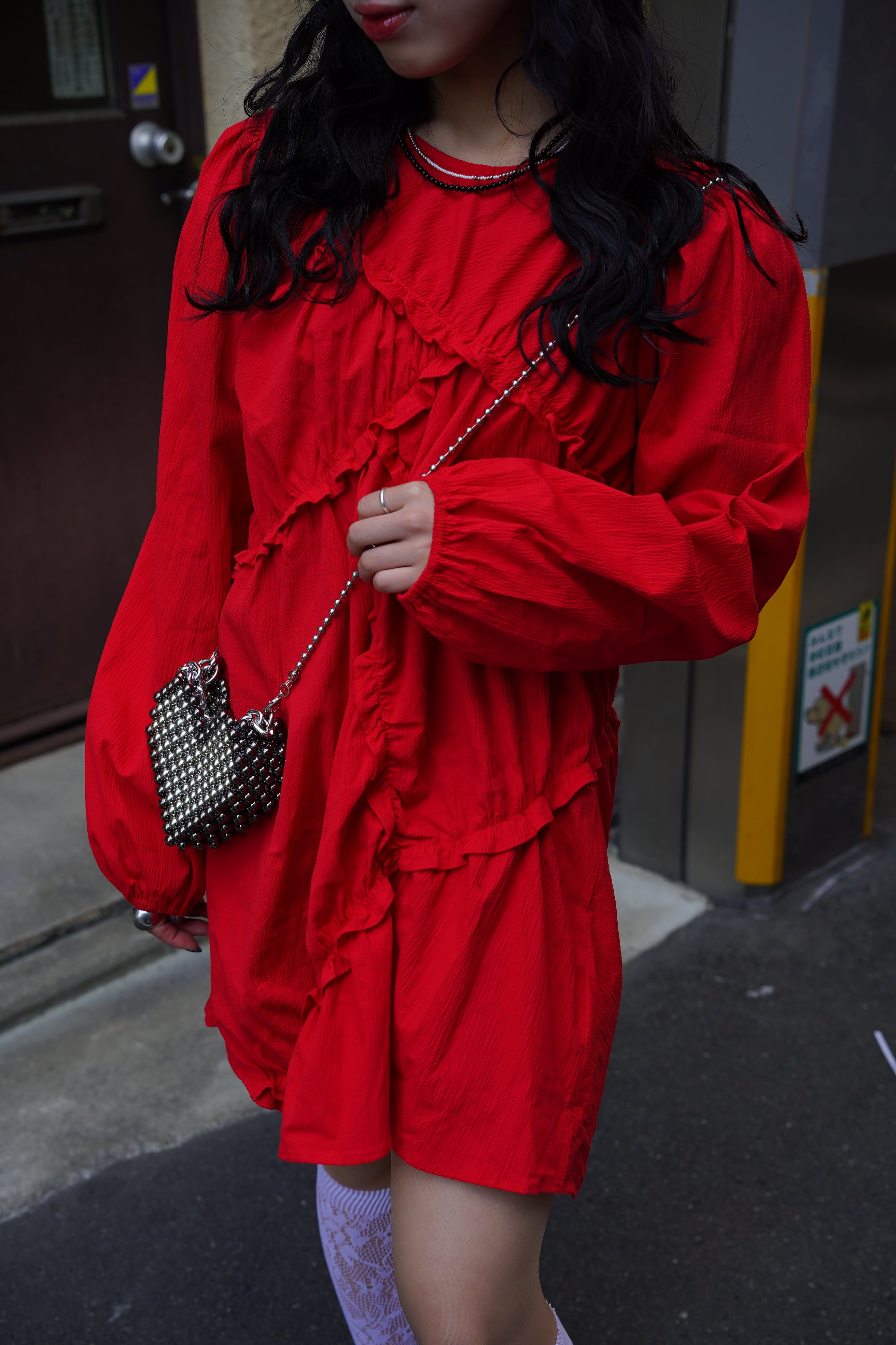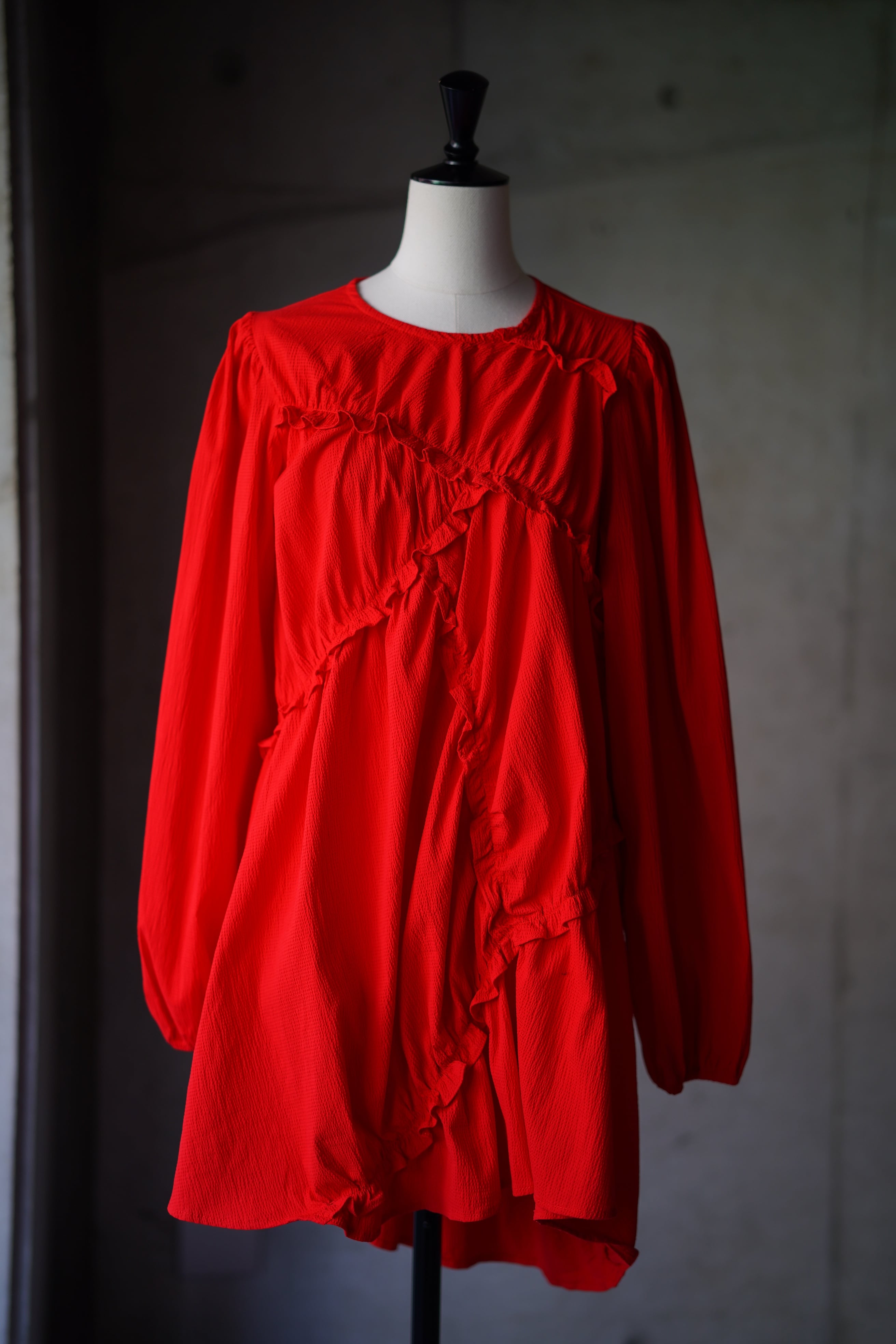 アシンメトリーなシルエットとラッフルのディテールが魅惑的なリズムを生み出します。