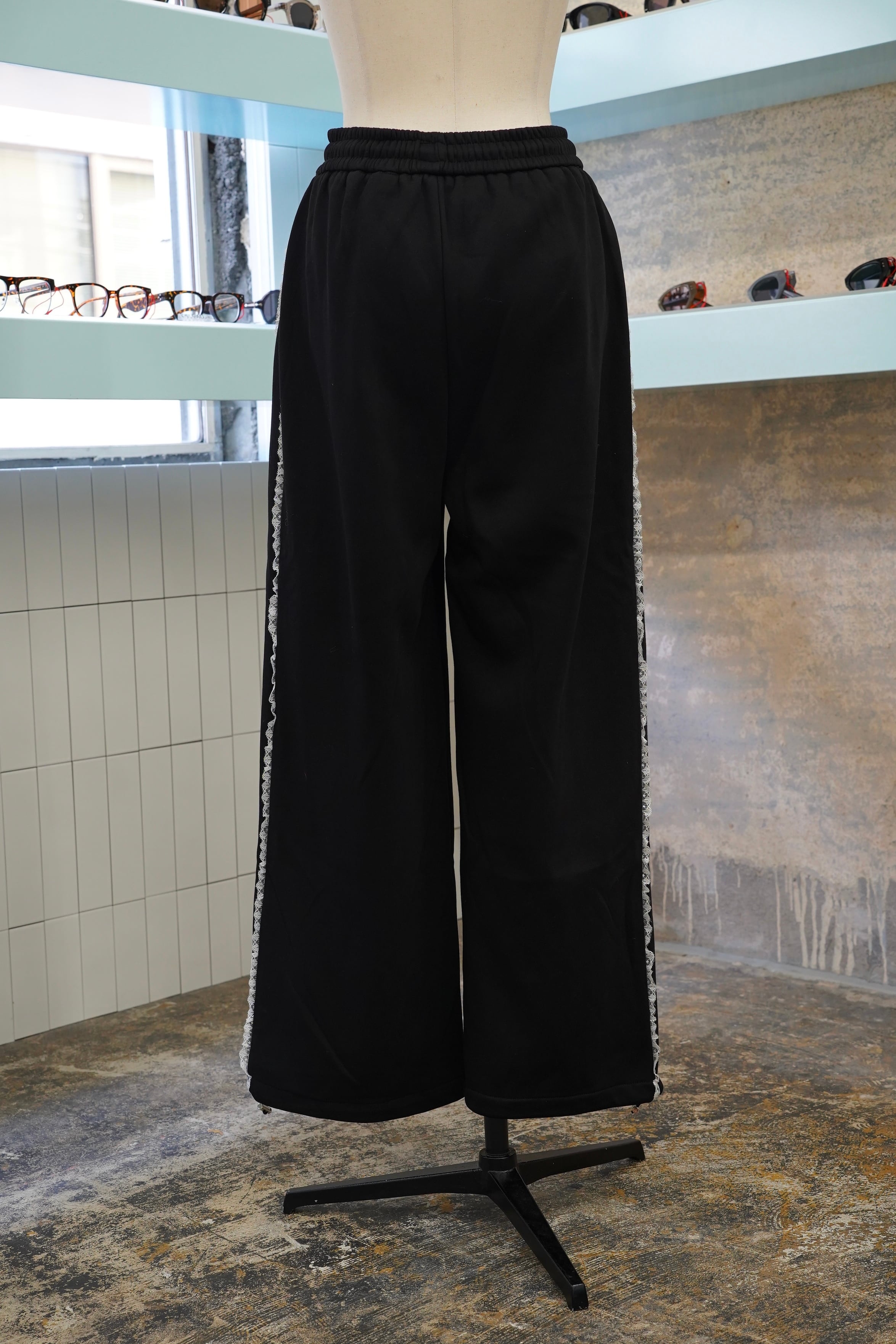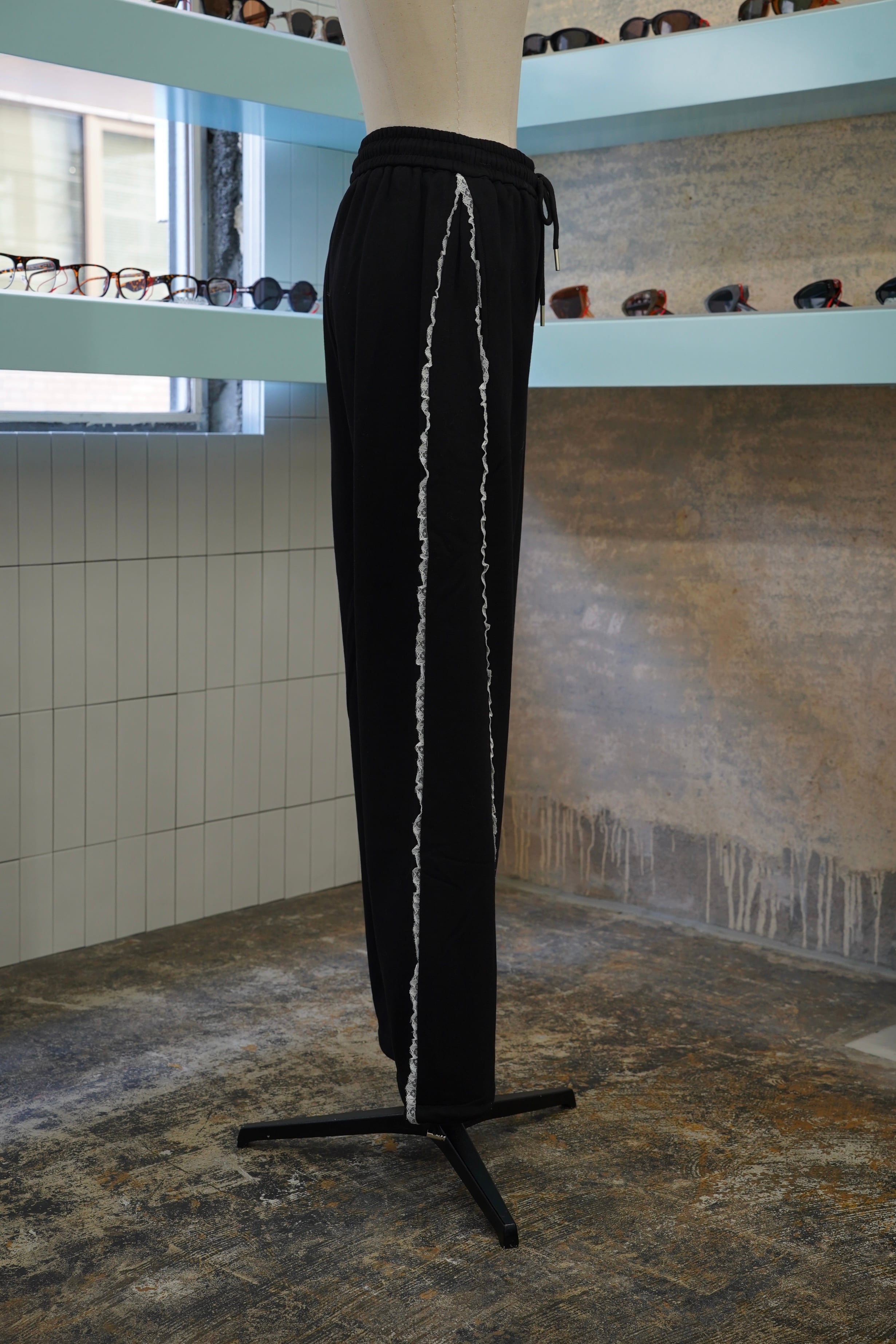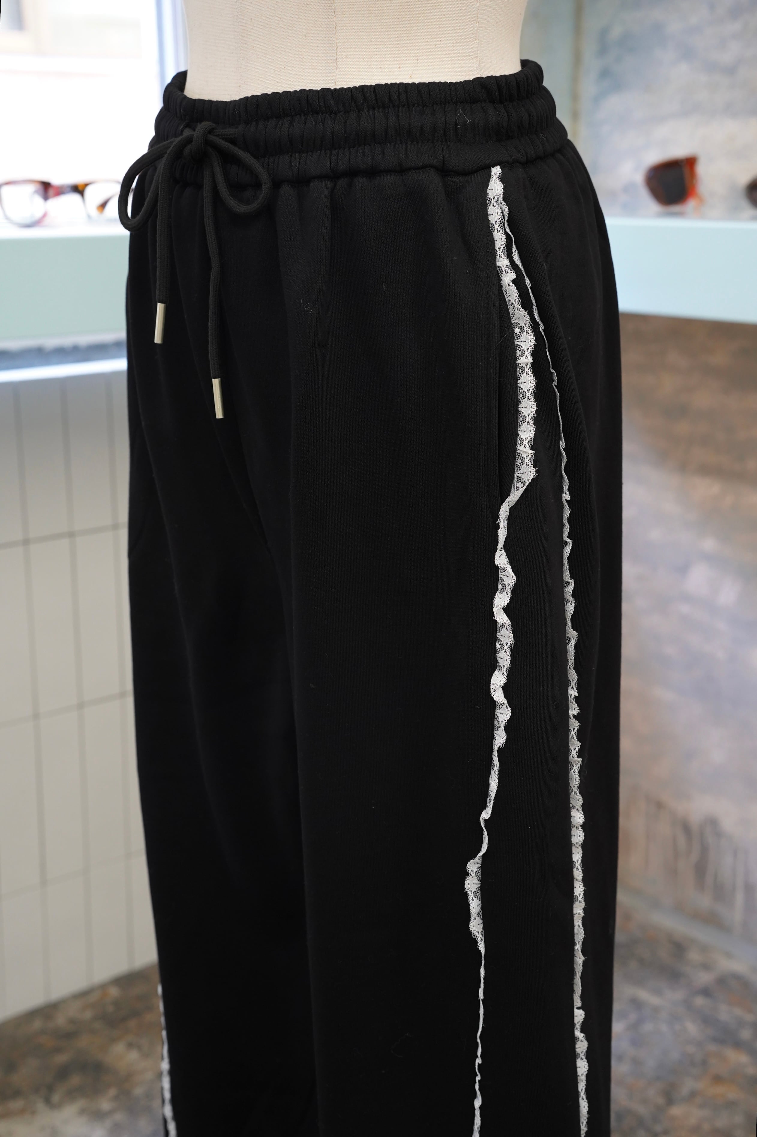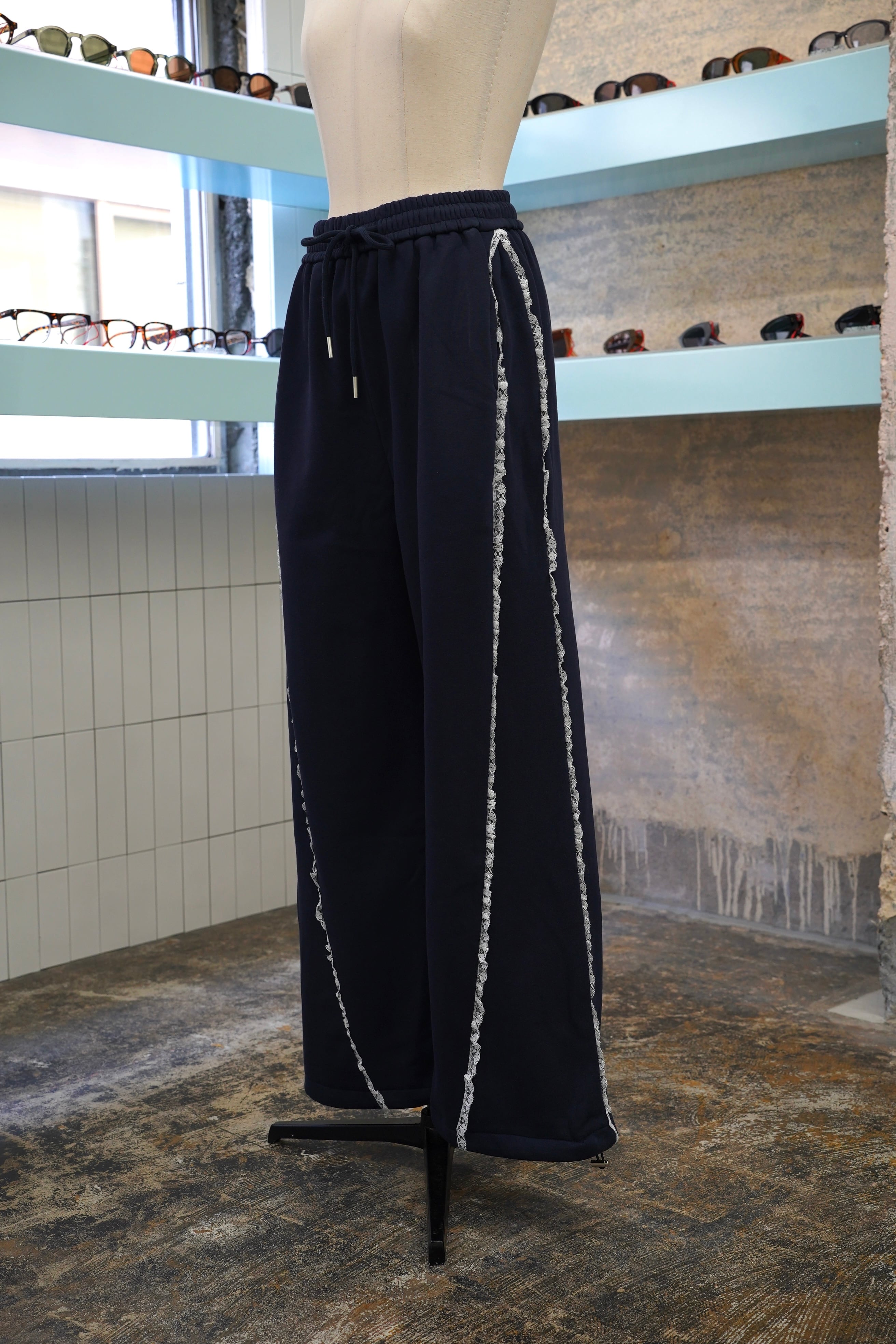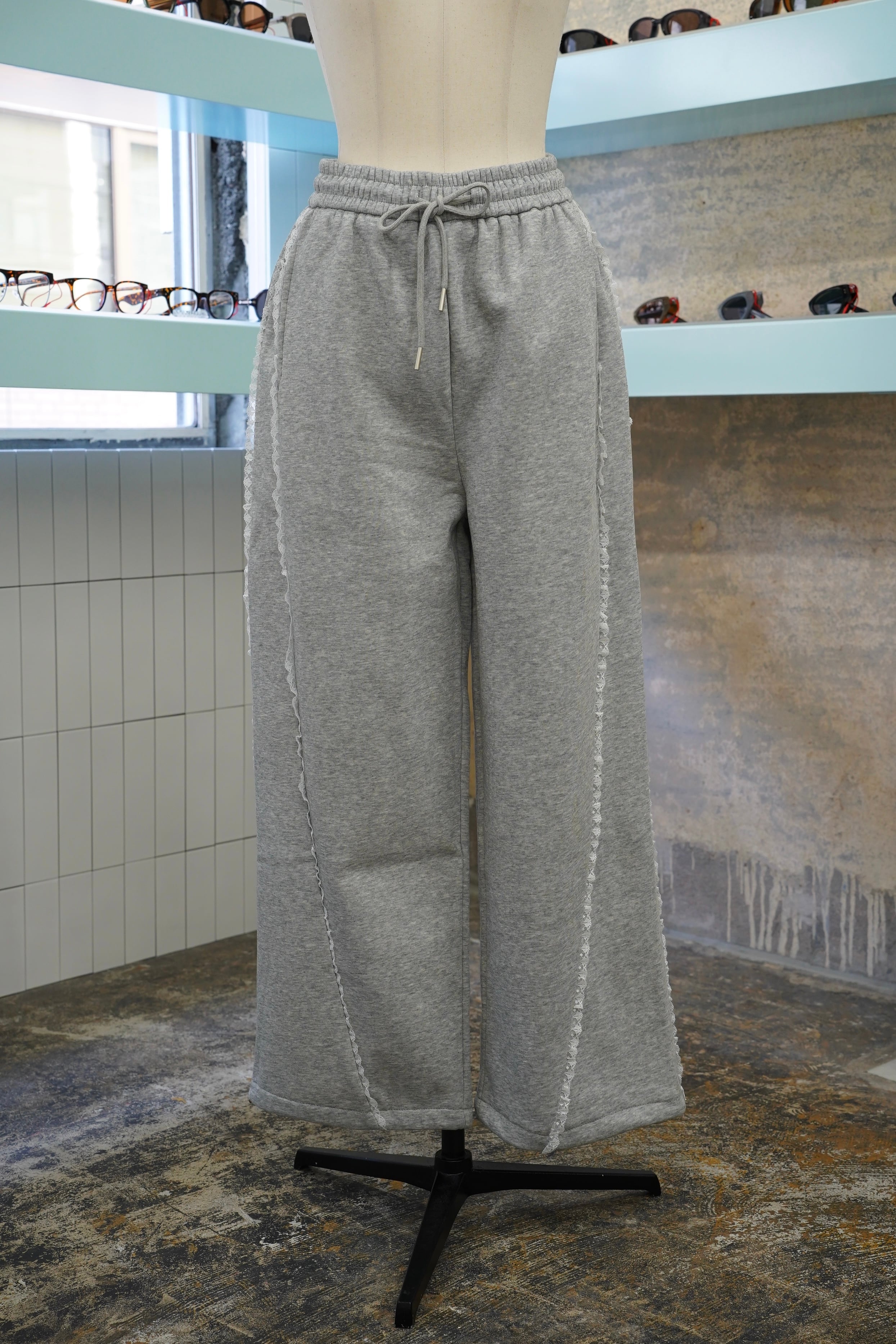 「LASE LINE SWEAT PANTS」は、サイドにエレガントなレースが施されたスウェットパンツです。