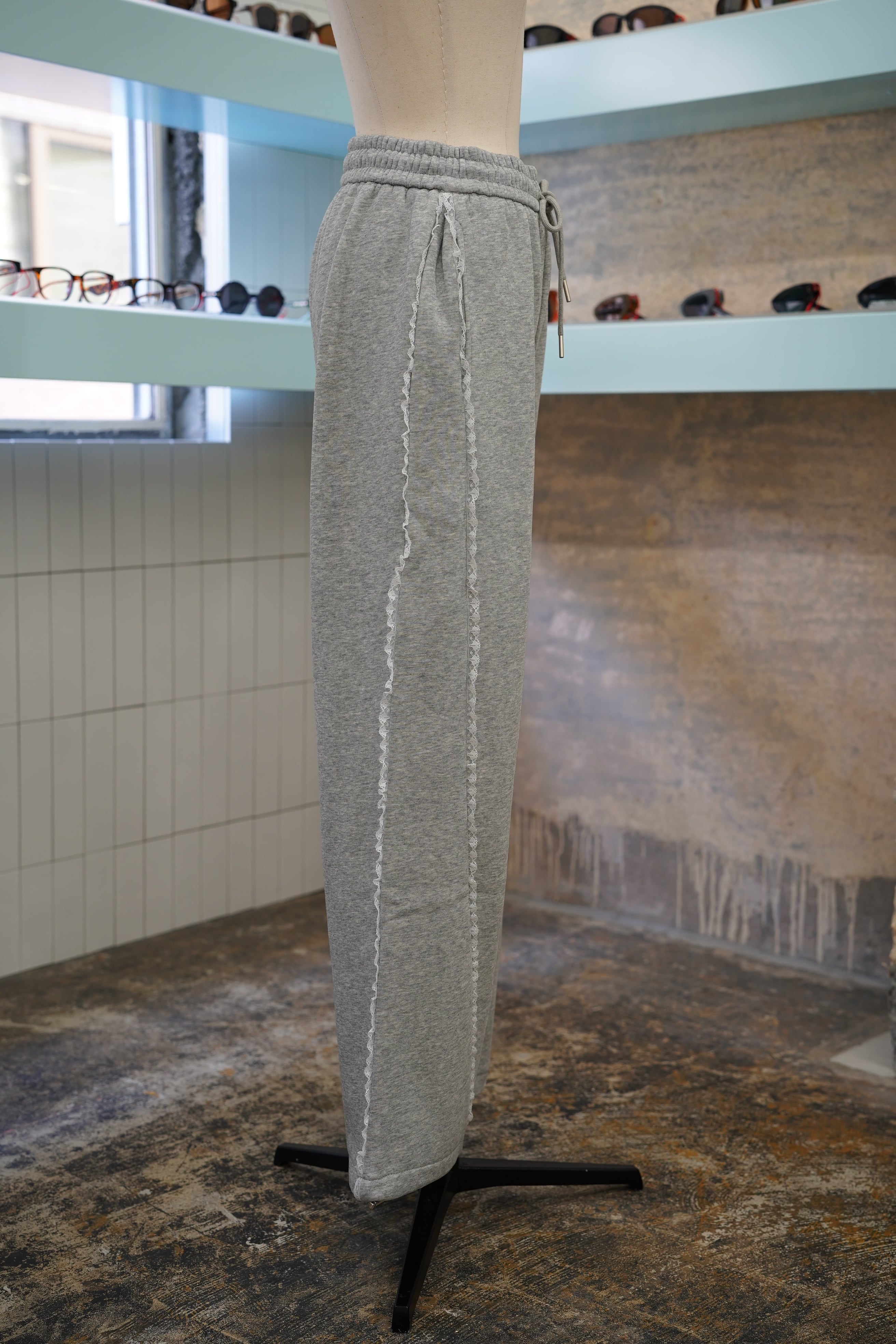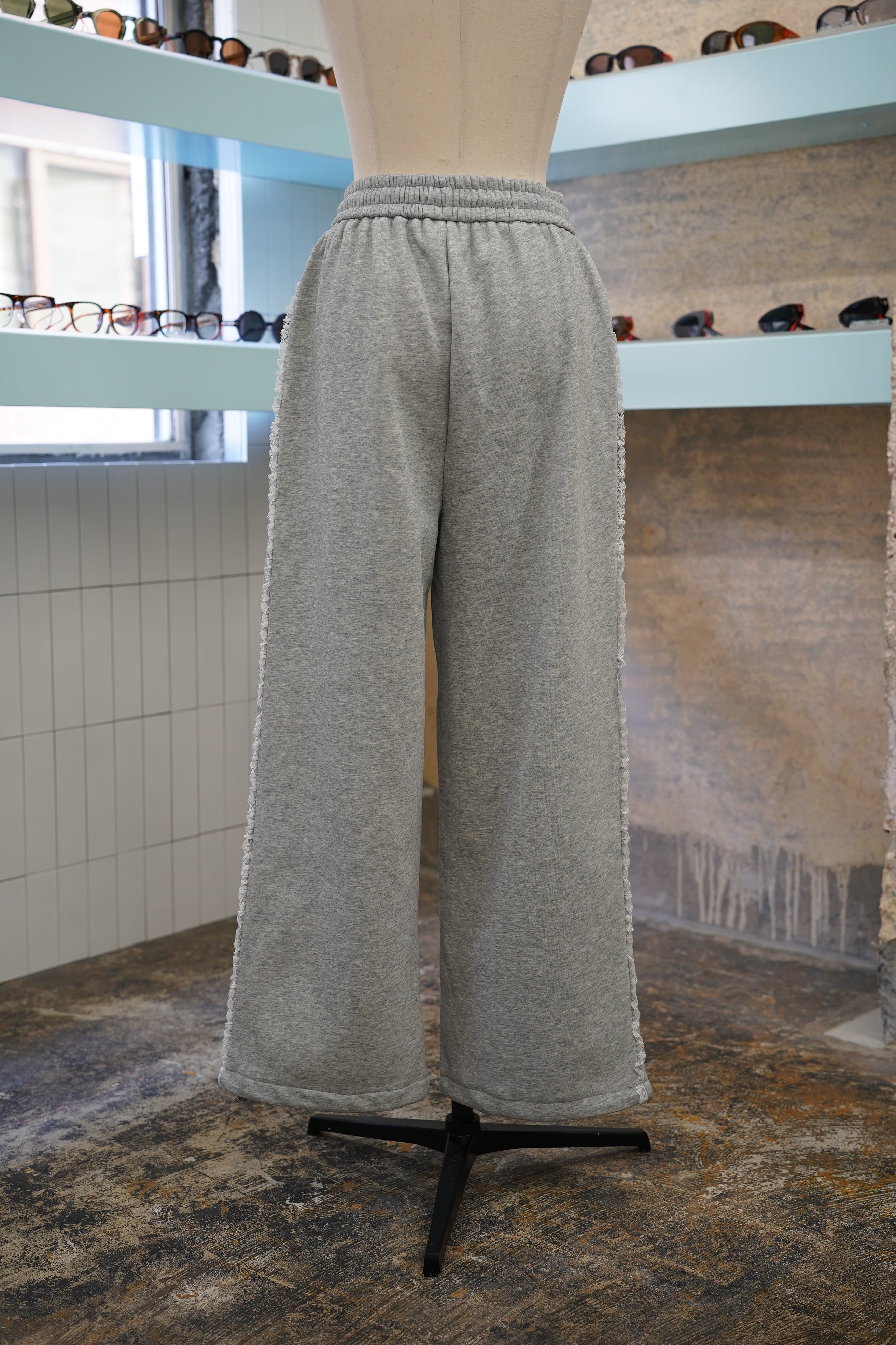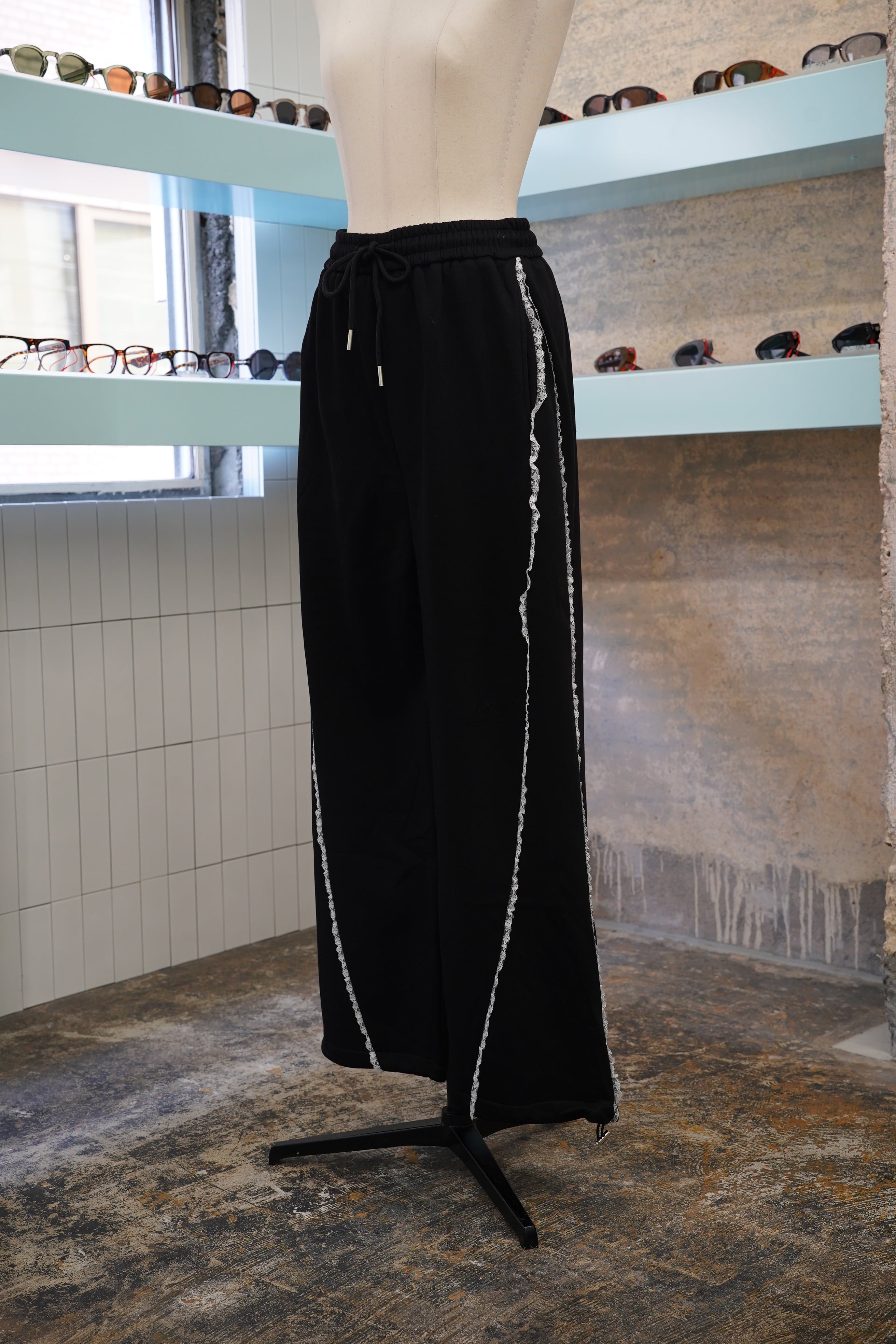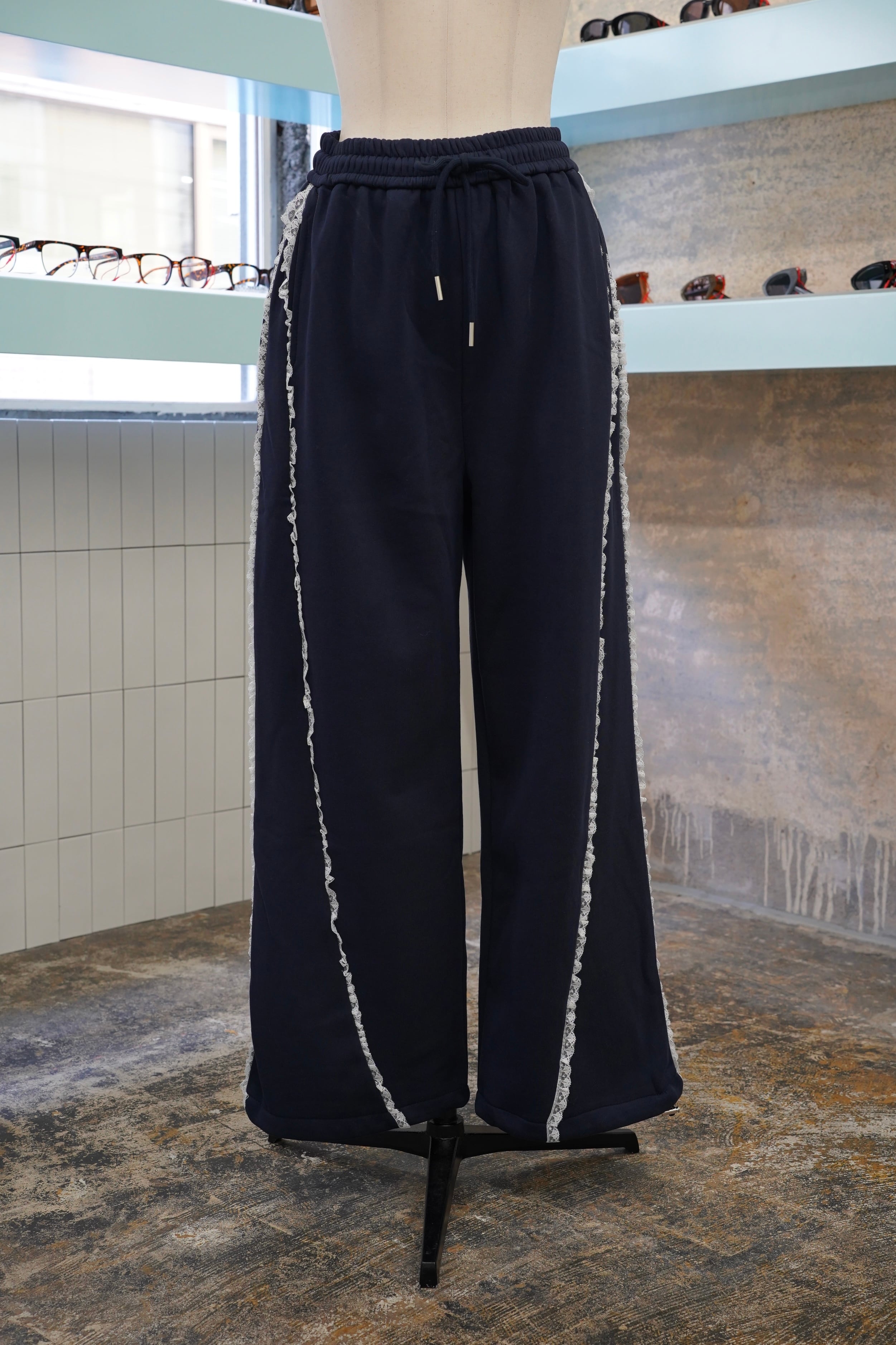 「LASE LINE SWEAT PANTS」は、サイドにエレガントなレースが施されたスウェットパンツです。