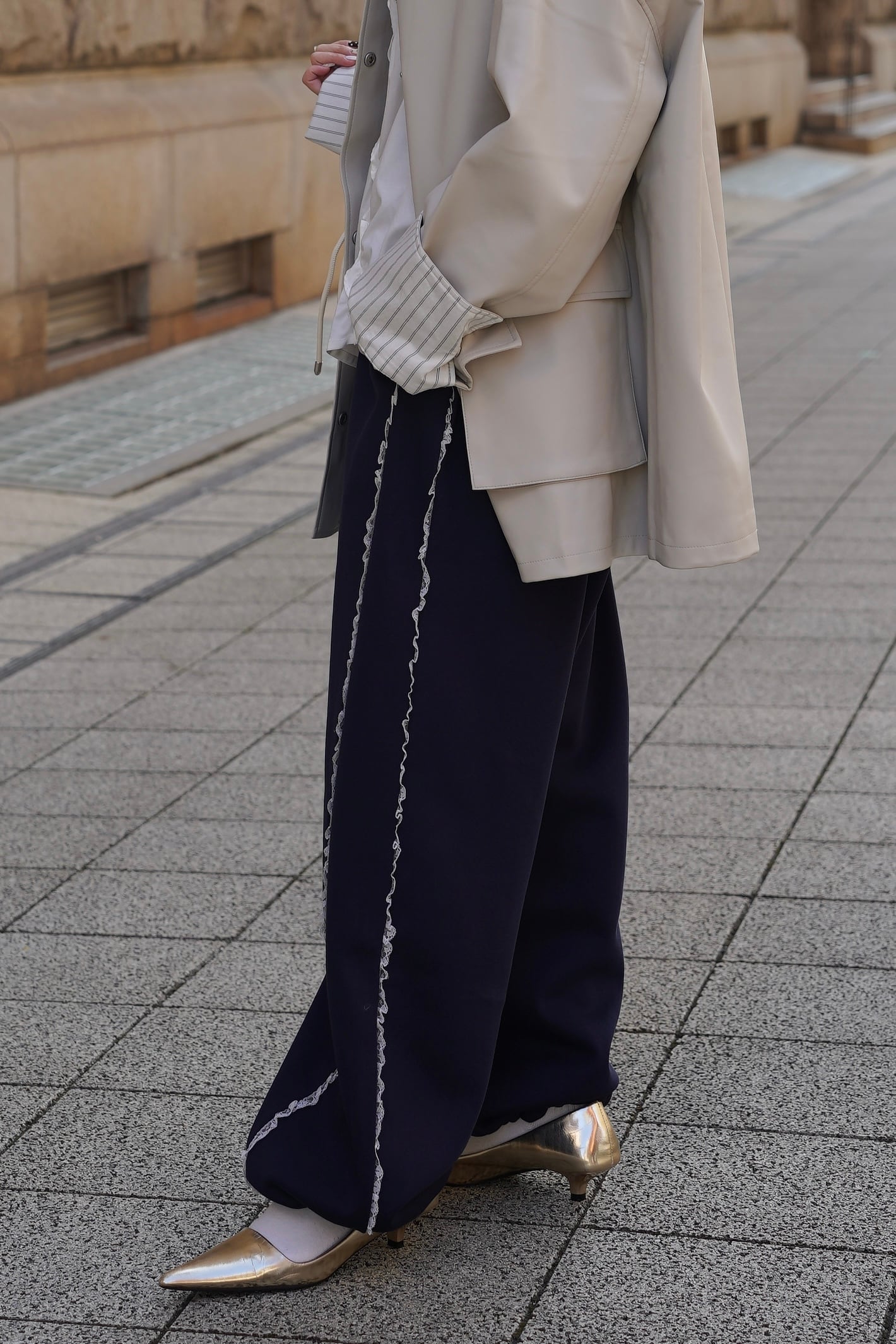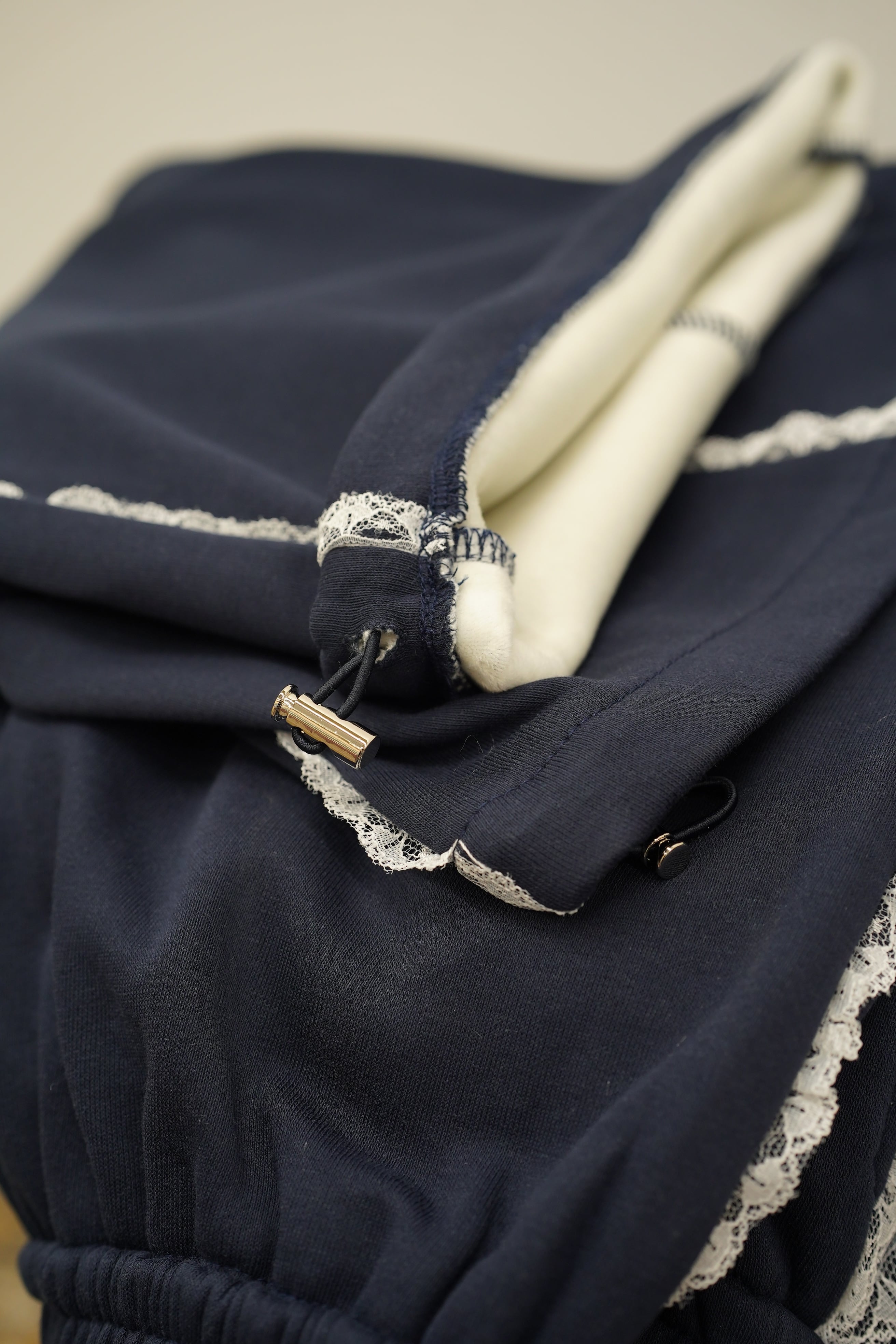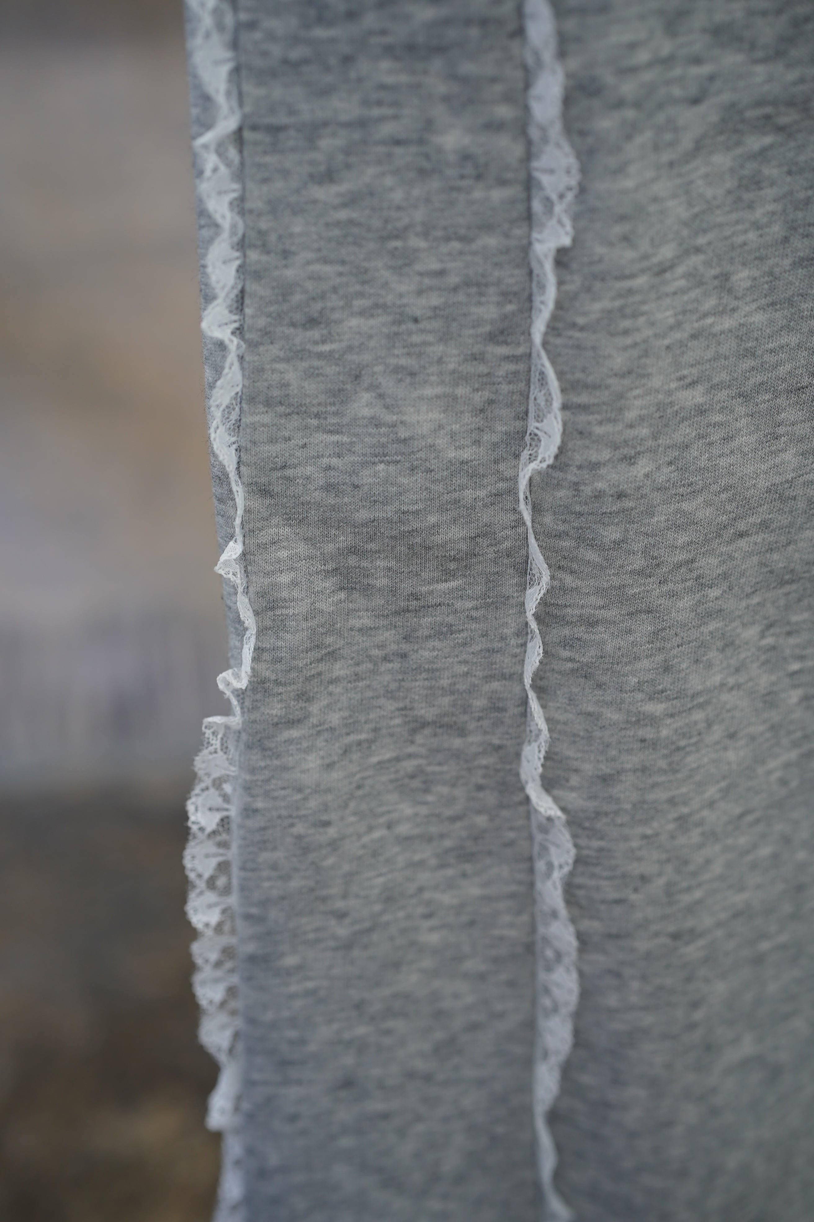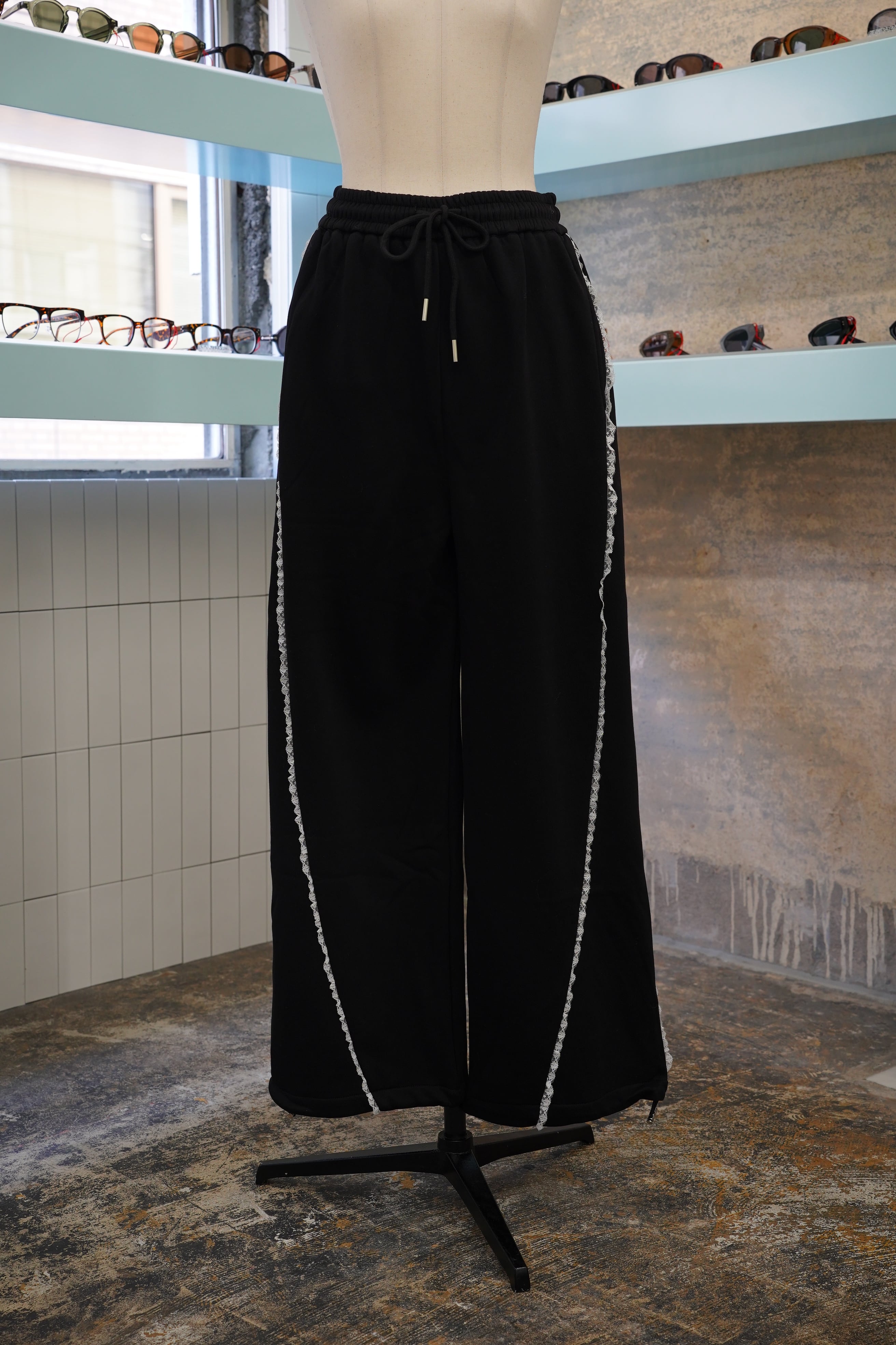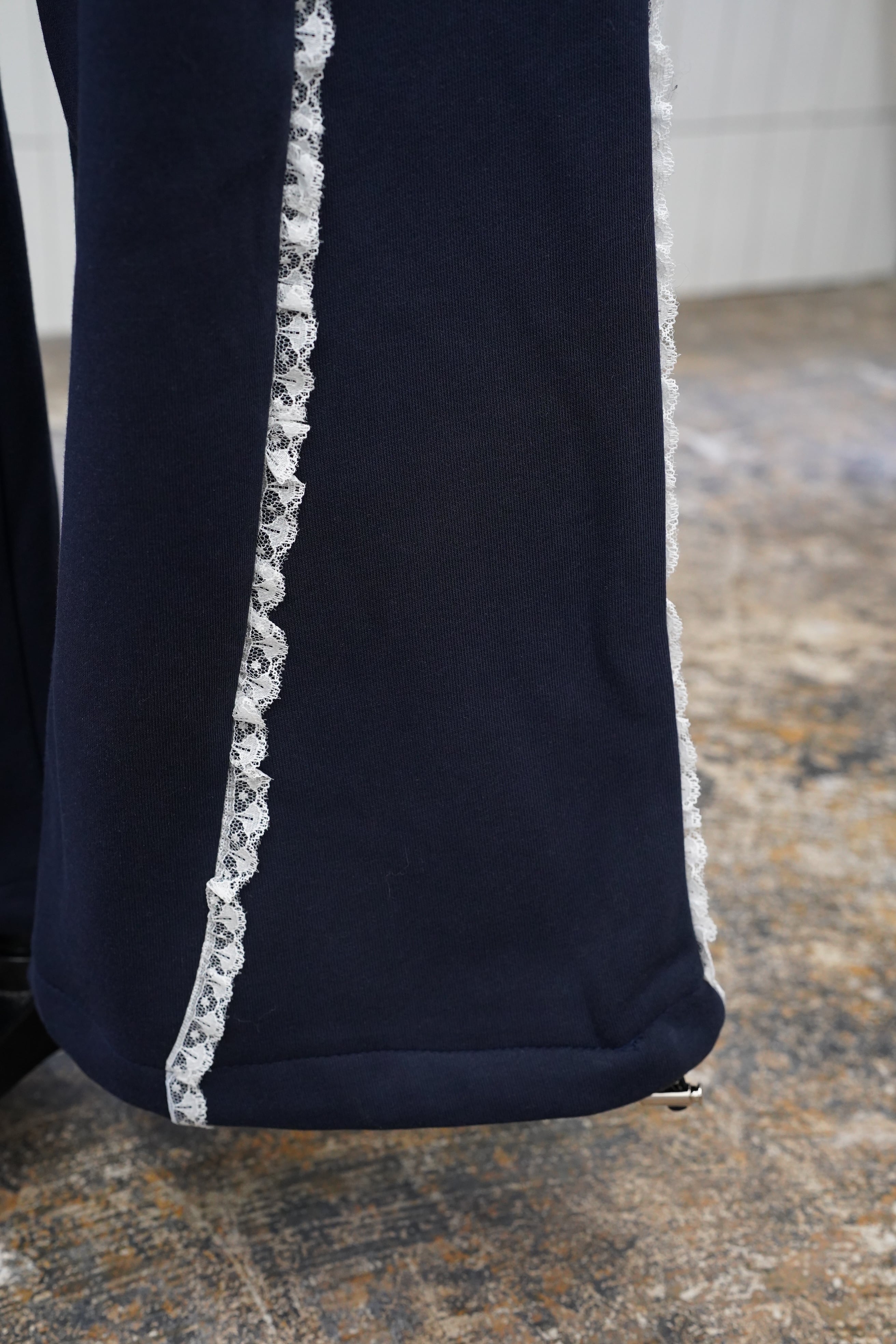 「LASE LINE SWEAT PANTS」は、サイドにエレガントなレースが施されたスウェットパンツです。