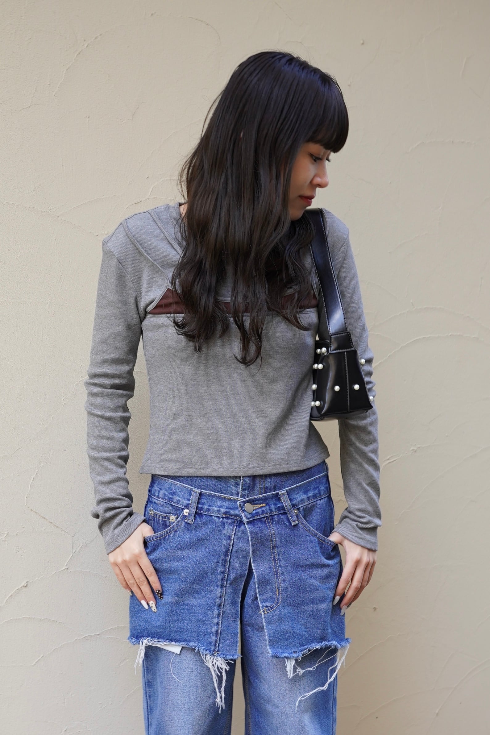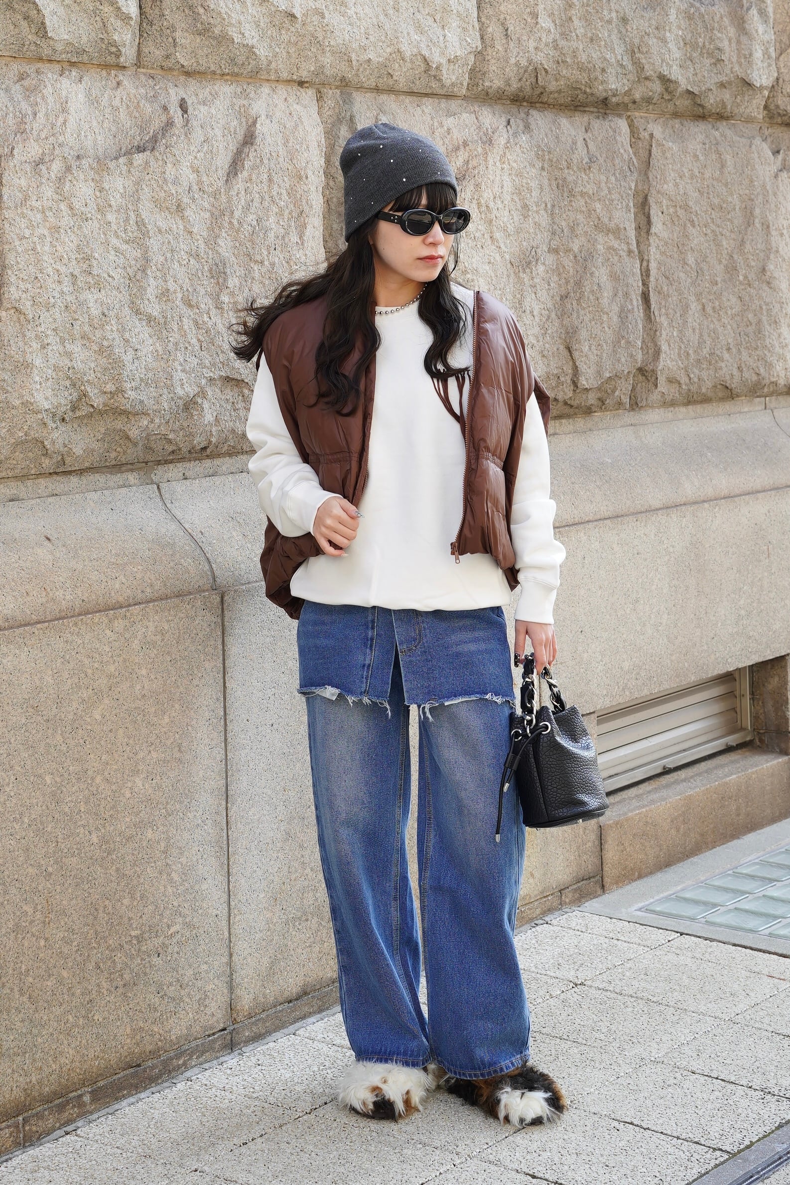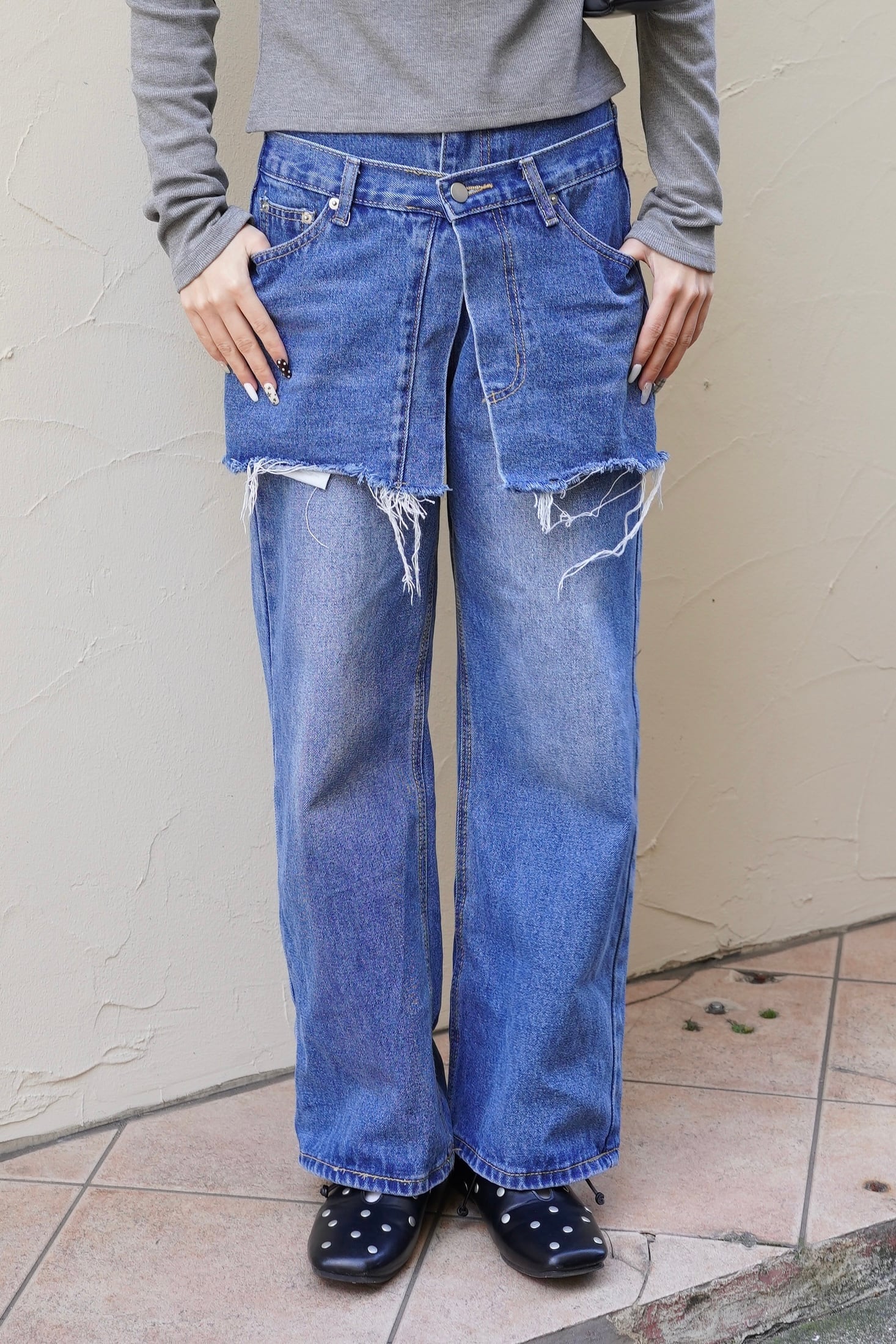 「F.LAYERD RAP DENIM PANTS」は、前がレイヤードのようなデザインが特徴的なデニムパンツです。
