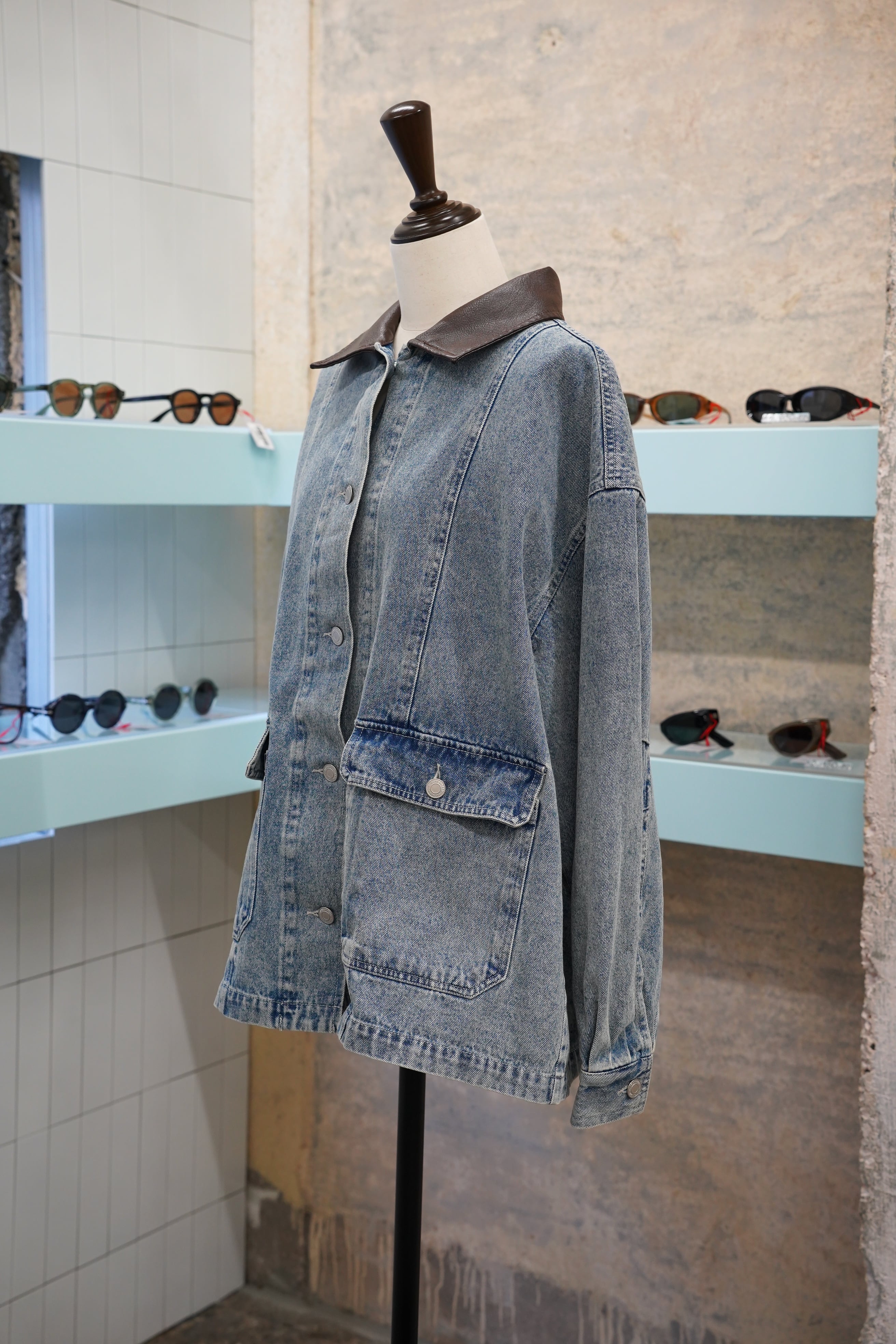 「ERI PU DENIM COVERALL」は、襟部分にフェイクレザーを使用したスタイリッシュなデニムカバーオールです。