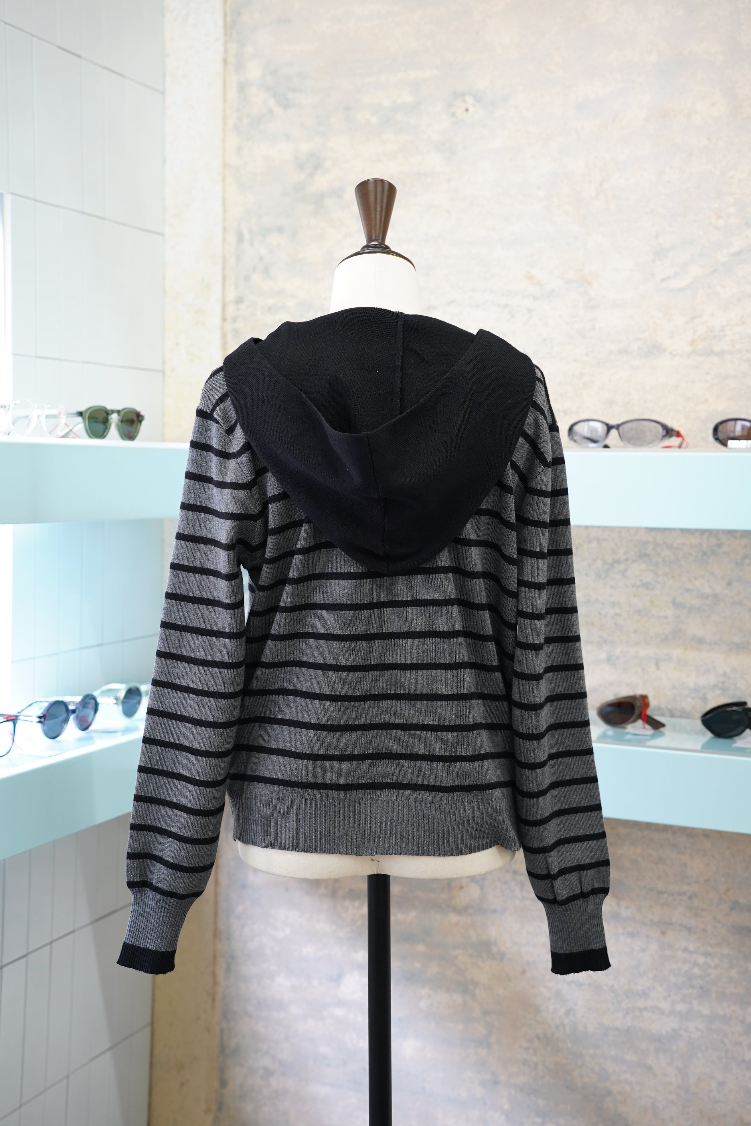 フード付きのパーカー風カーディガンで、カジュアルなスタイルを楽しめます。