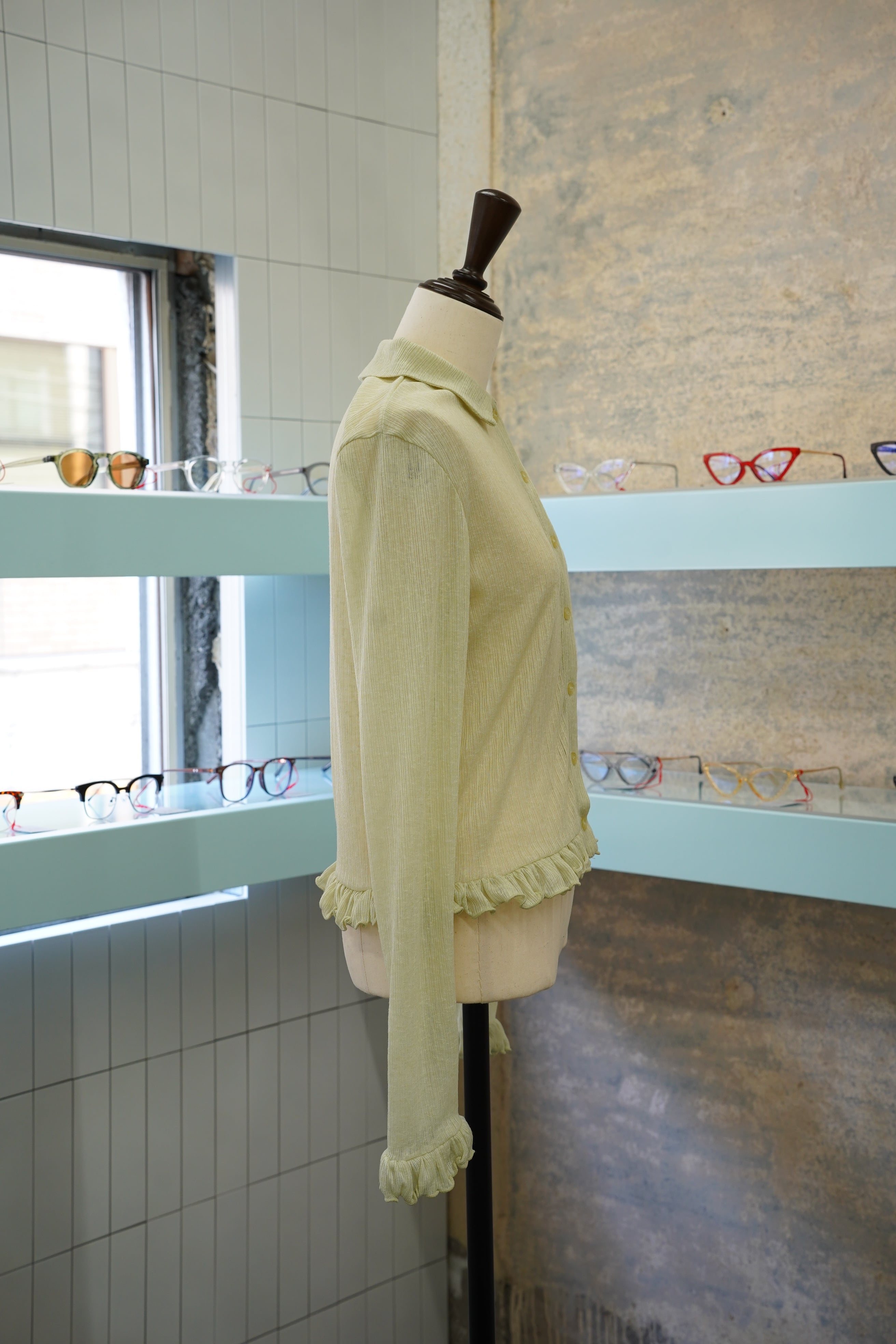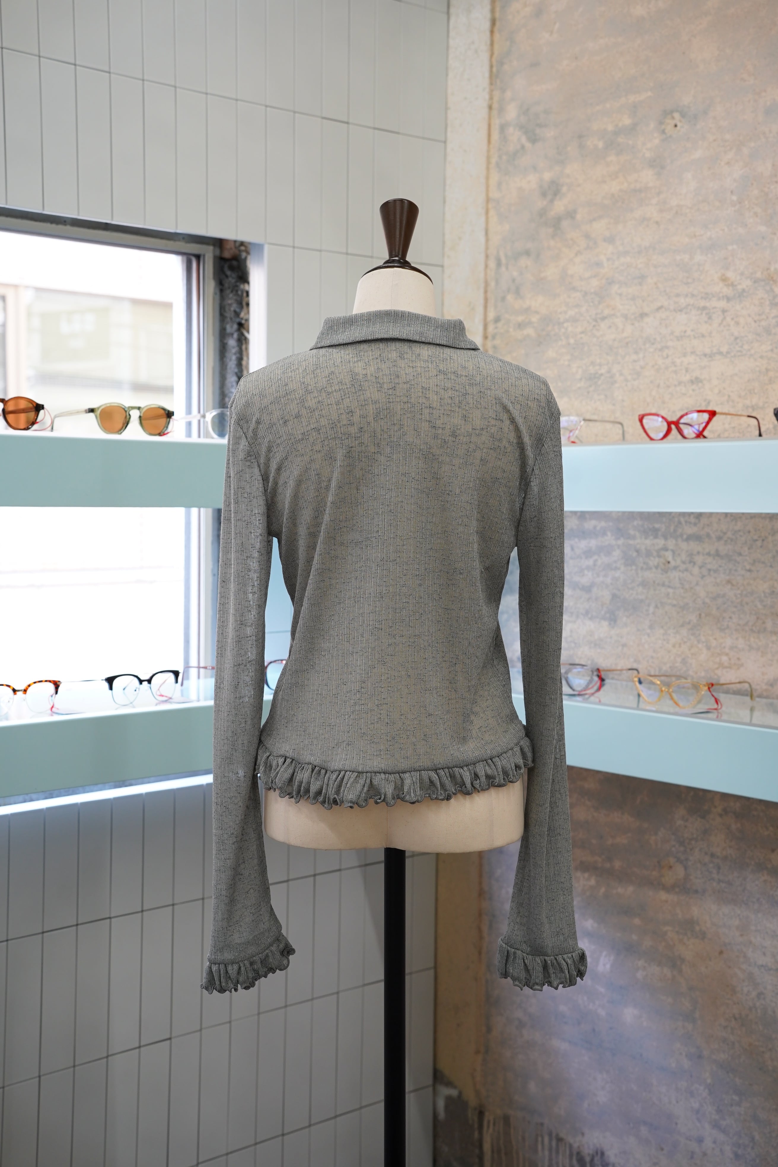 少し透けた素材感と、フリルが施された袖と裾が特徴的な一枚です。