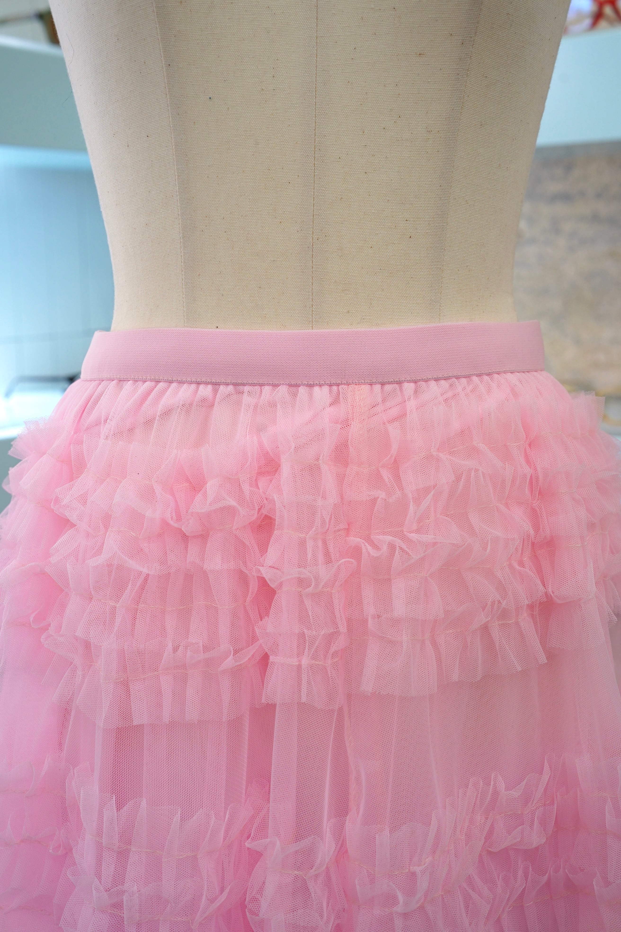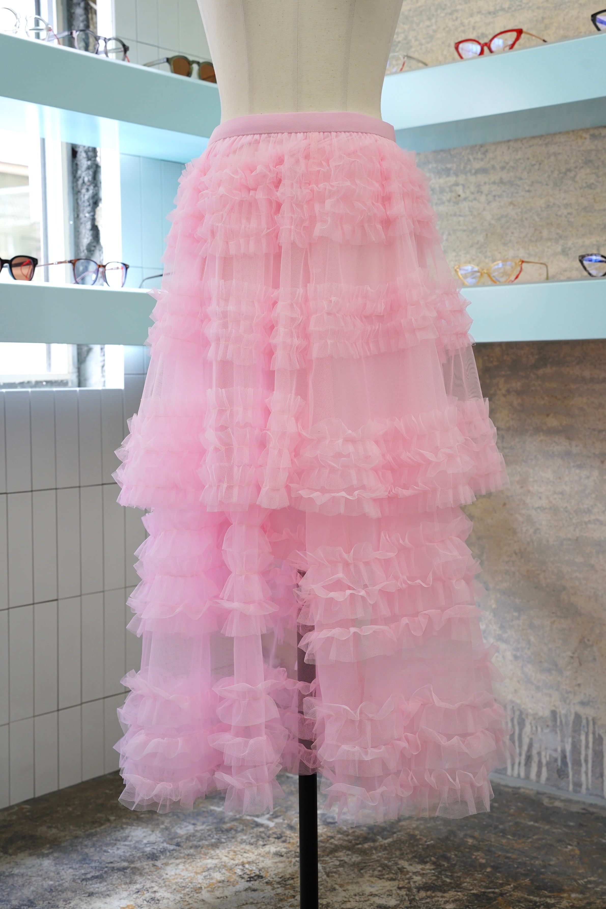 美しい段々のデザインと透け感が特徴的なこのロングスカートは、女性らしさを引き立てるアイテムです。