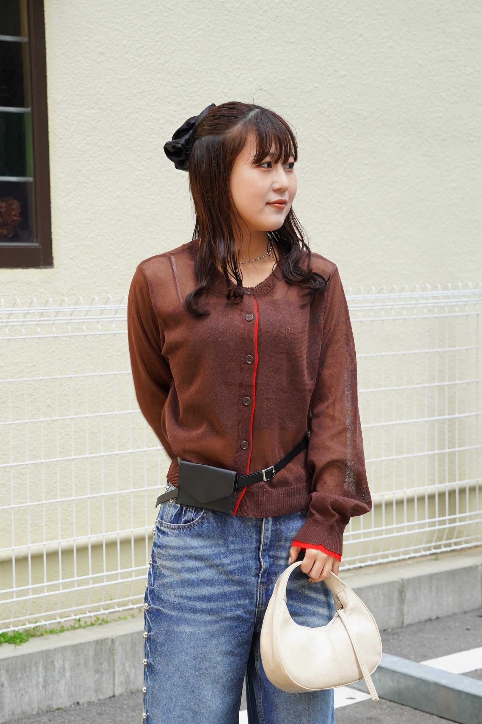 薄手で透け感のあるこのニットカーディガンは、バイカラーのデザインが特徴で、シンプルなコーディネートに華やかさを添えます。