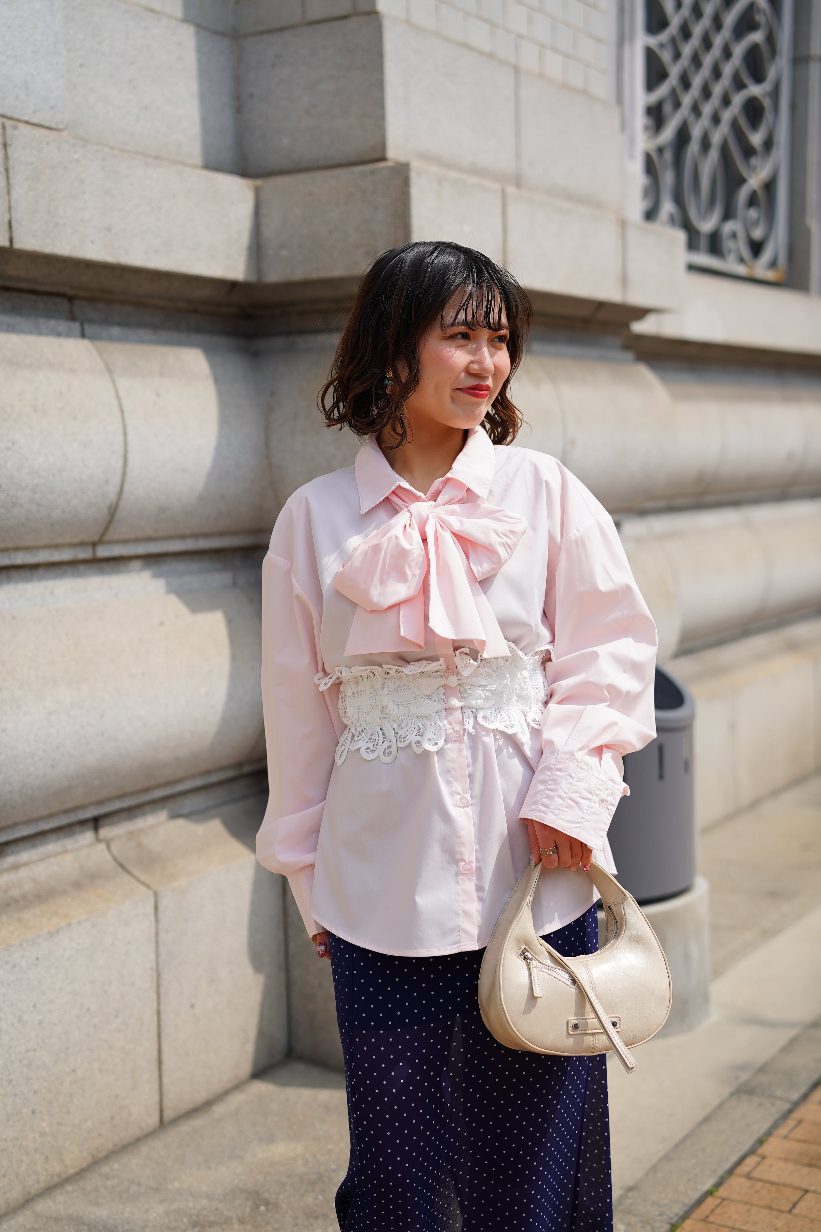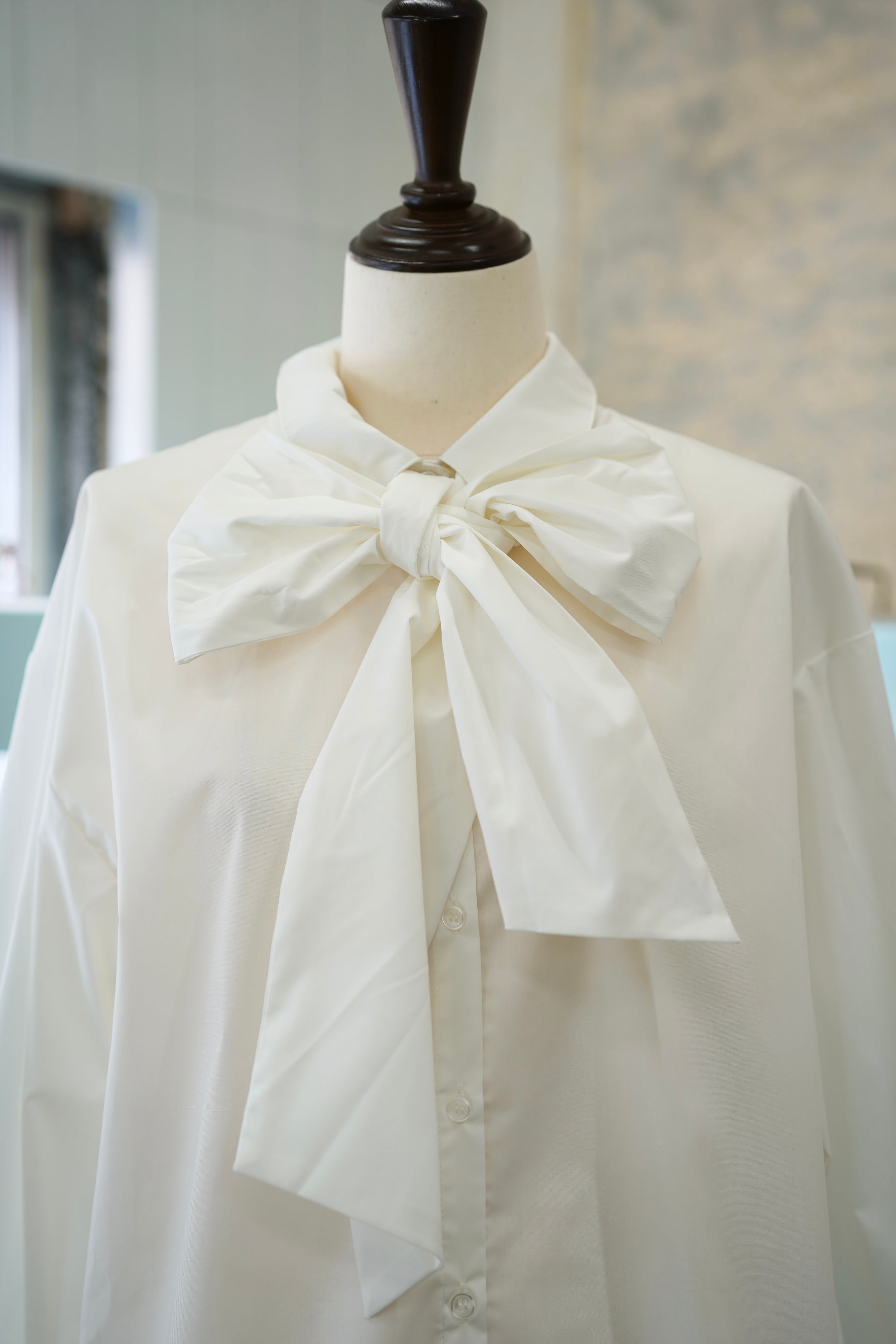 ボウタイがついたこの長袖シャツは、シンプルながらも洗練されたデザインが特徴で、さまざまなコーディネートに華やかさをプラスします。