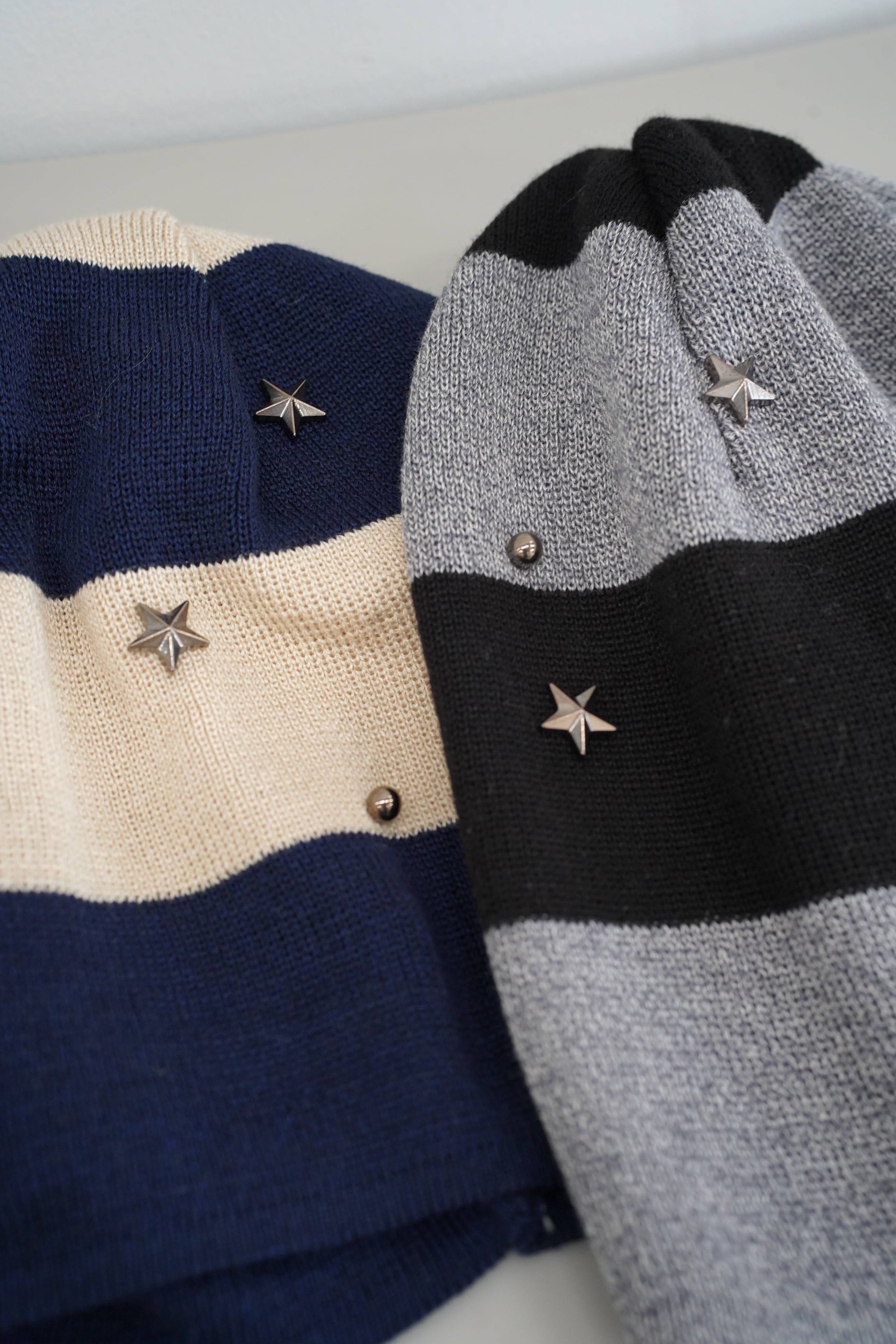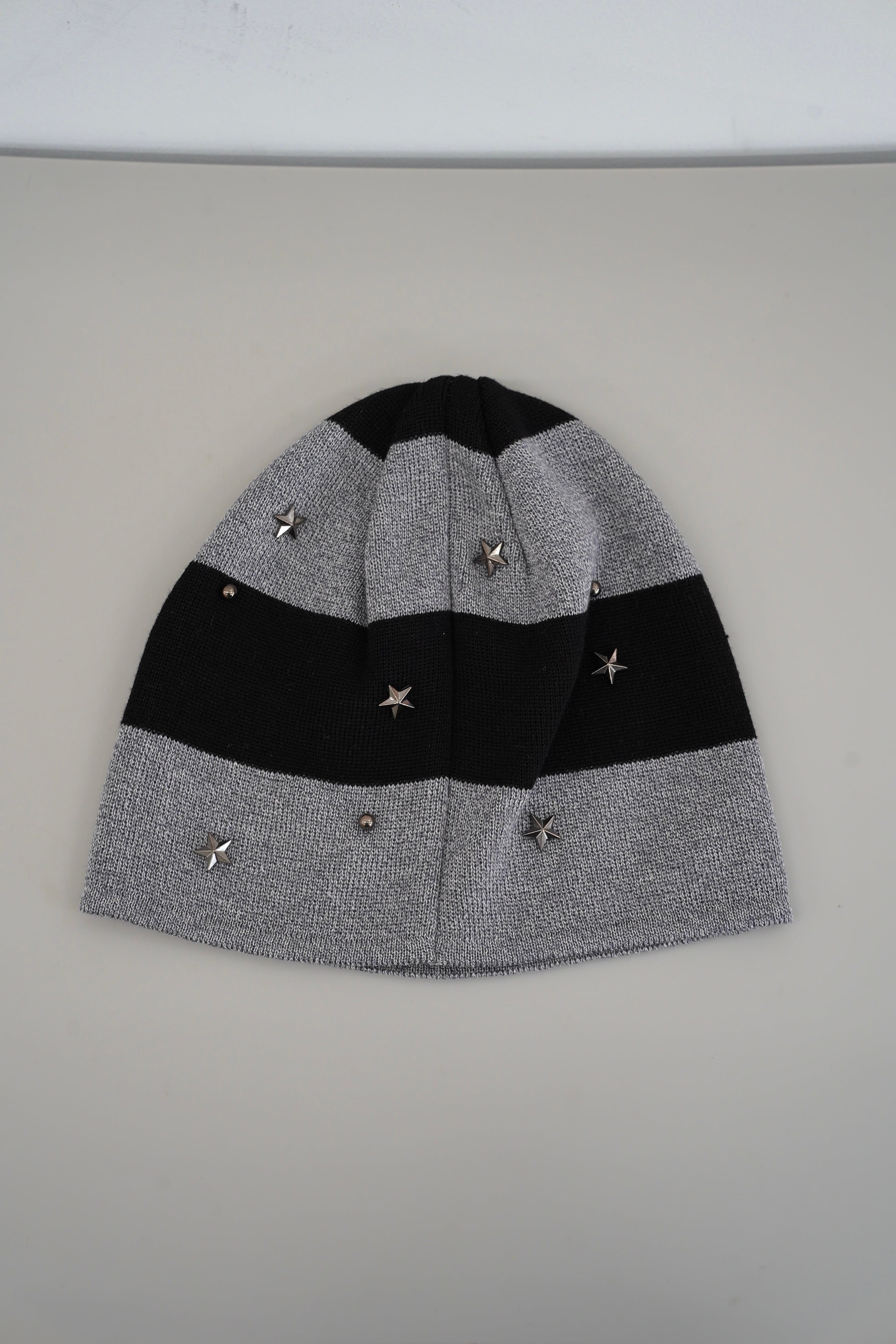 星型のスタッズが施されたボーダービーニーは、コーディネートに個性的なアクセントを加え、どんなスタイルにもマッチします。