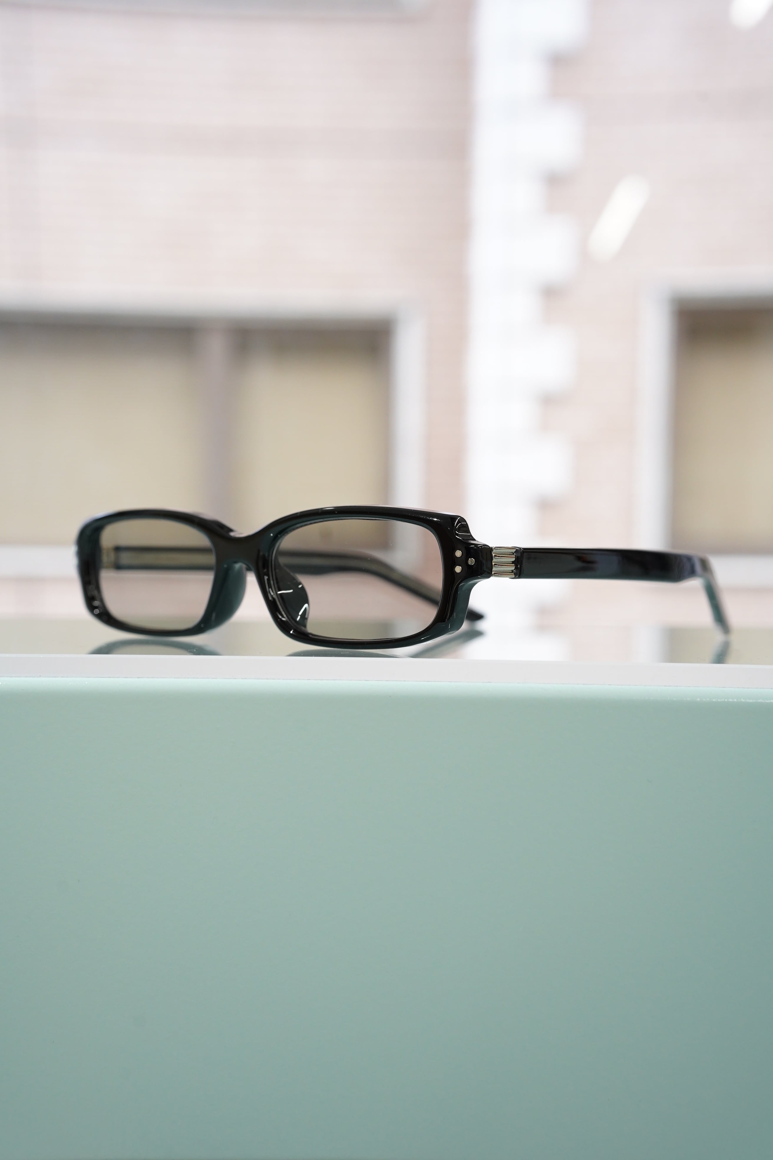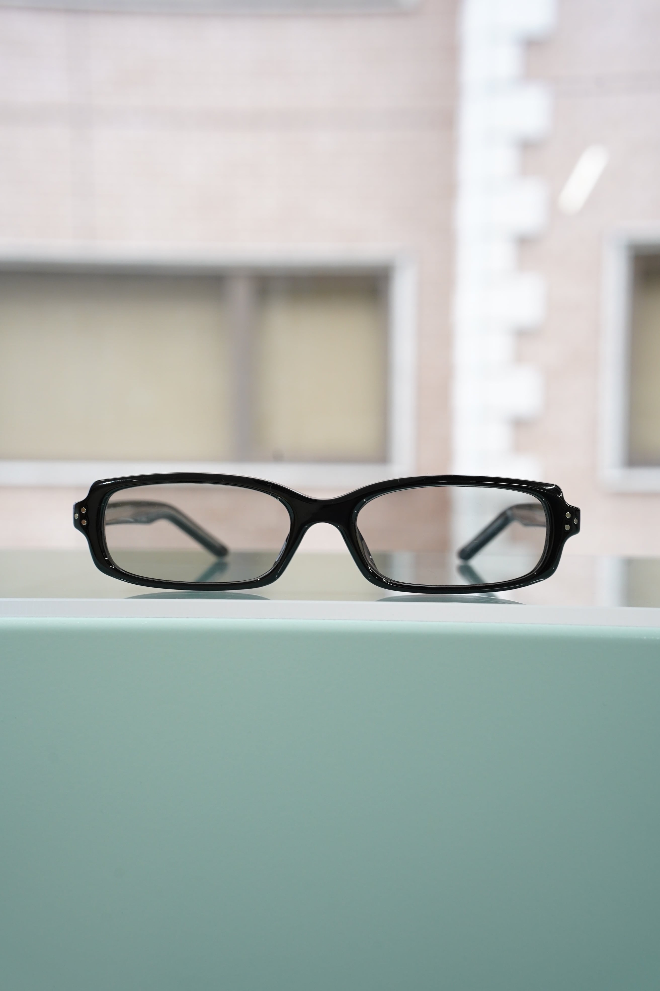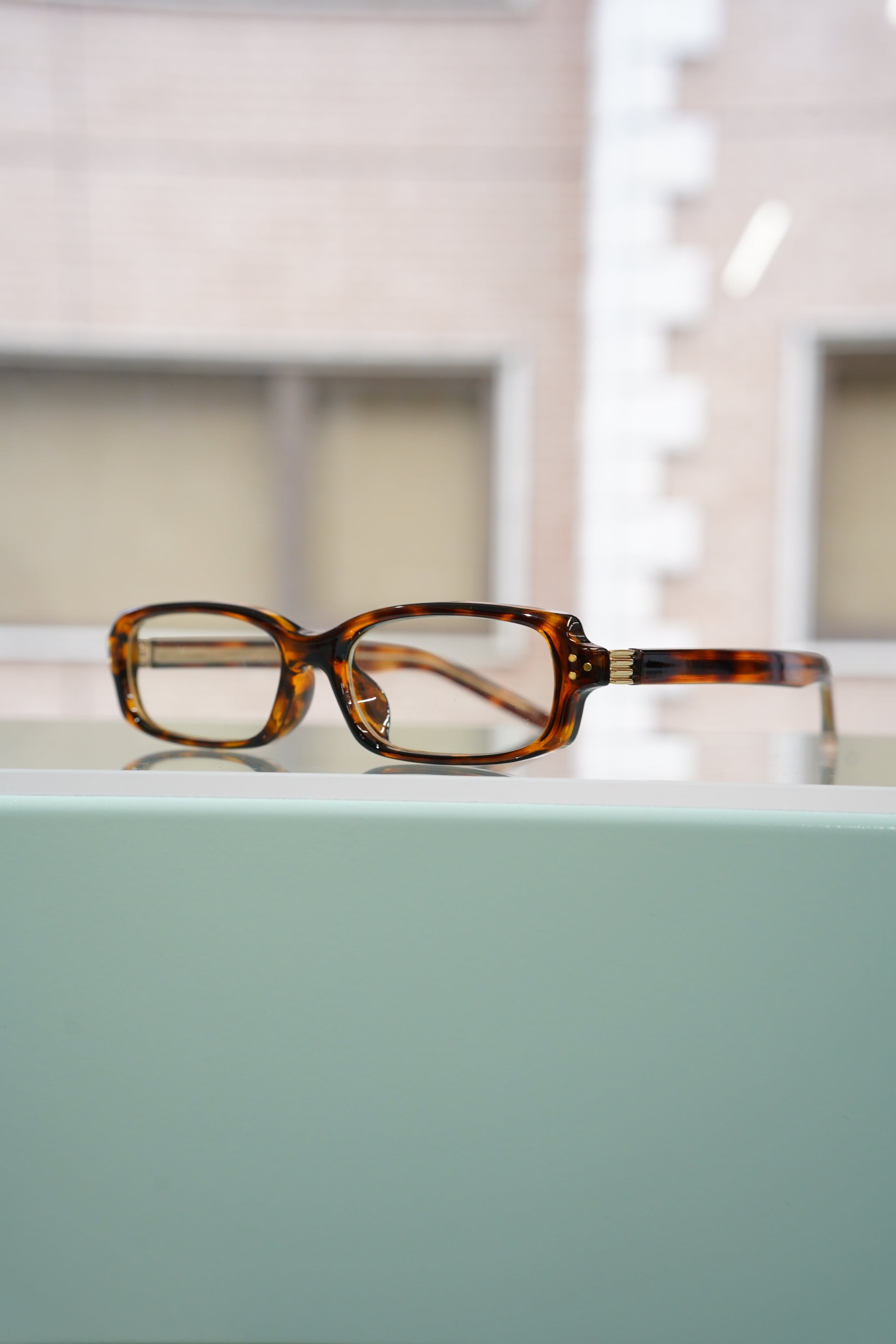 横に細長いレンズが特徴のこのメガネは、スタイリッシュな印象を与え、日常のファッションに華を添えます。