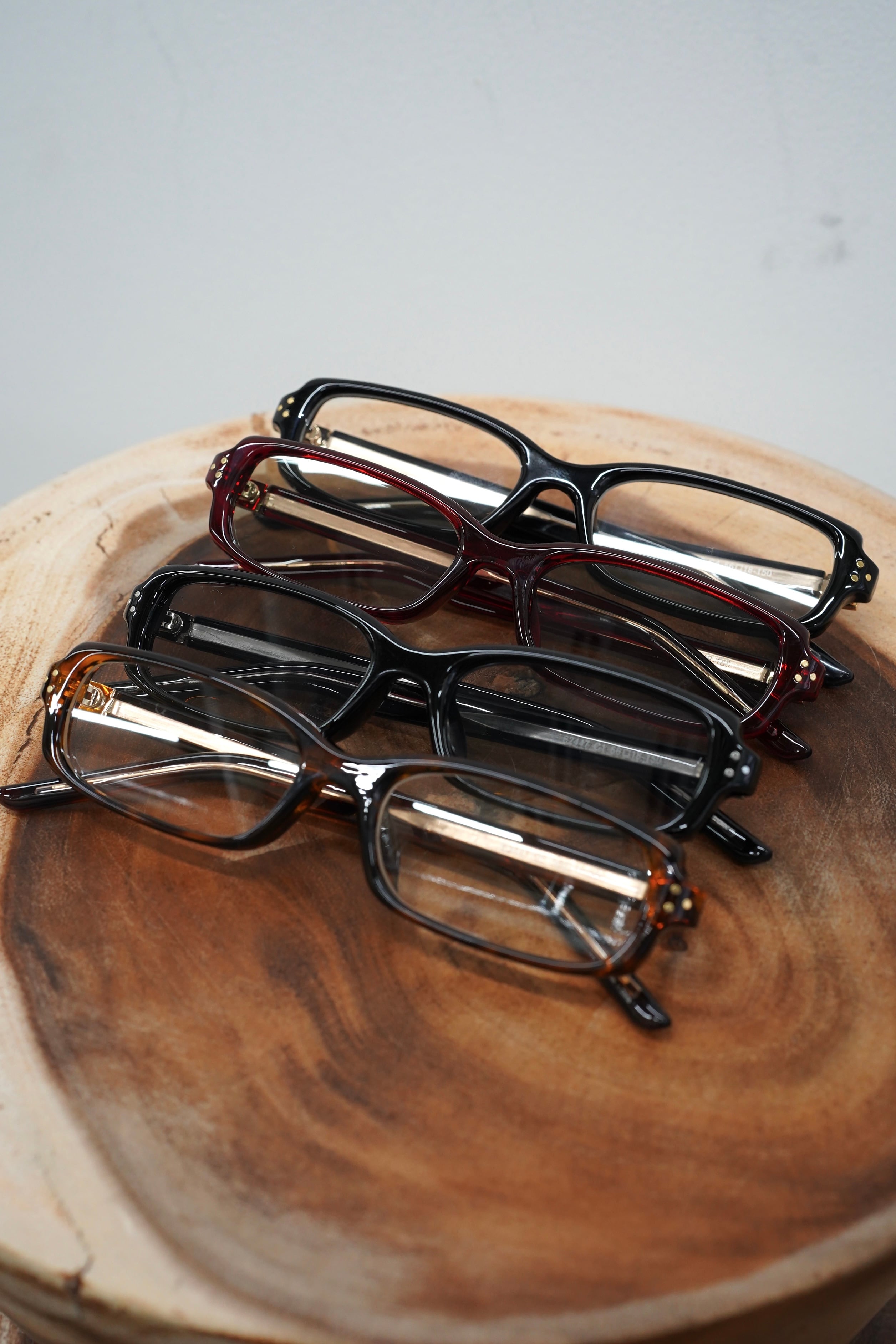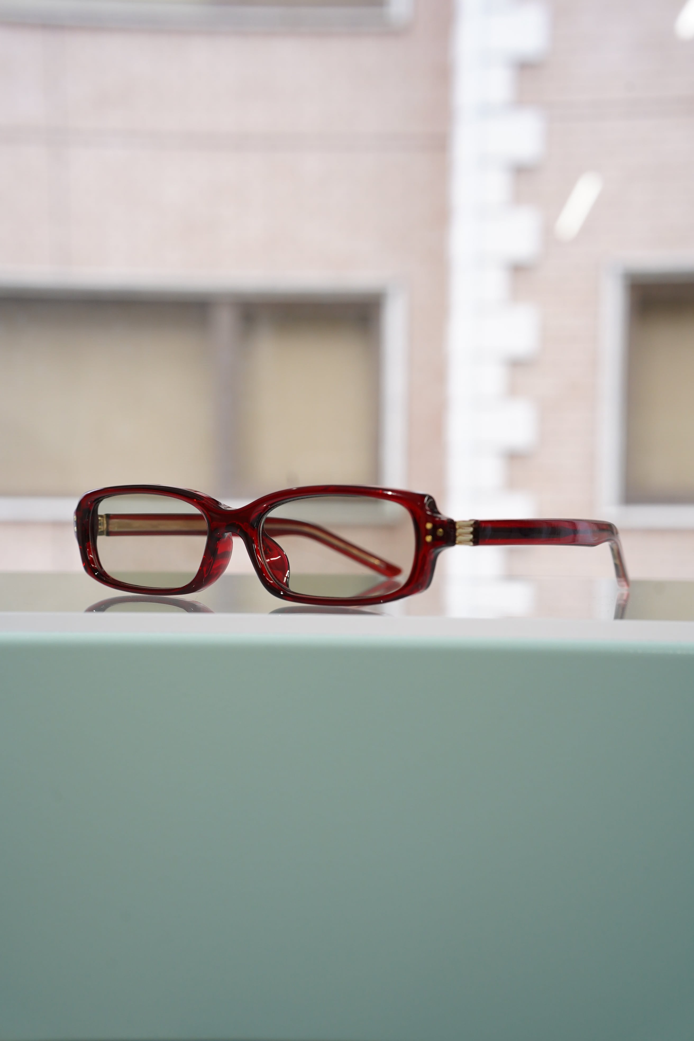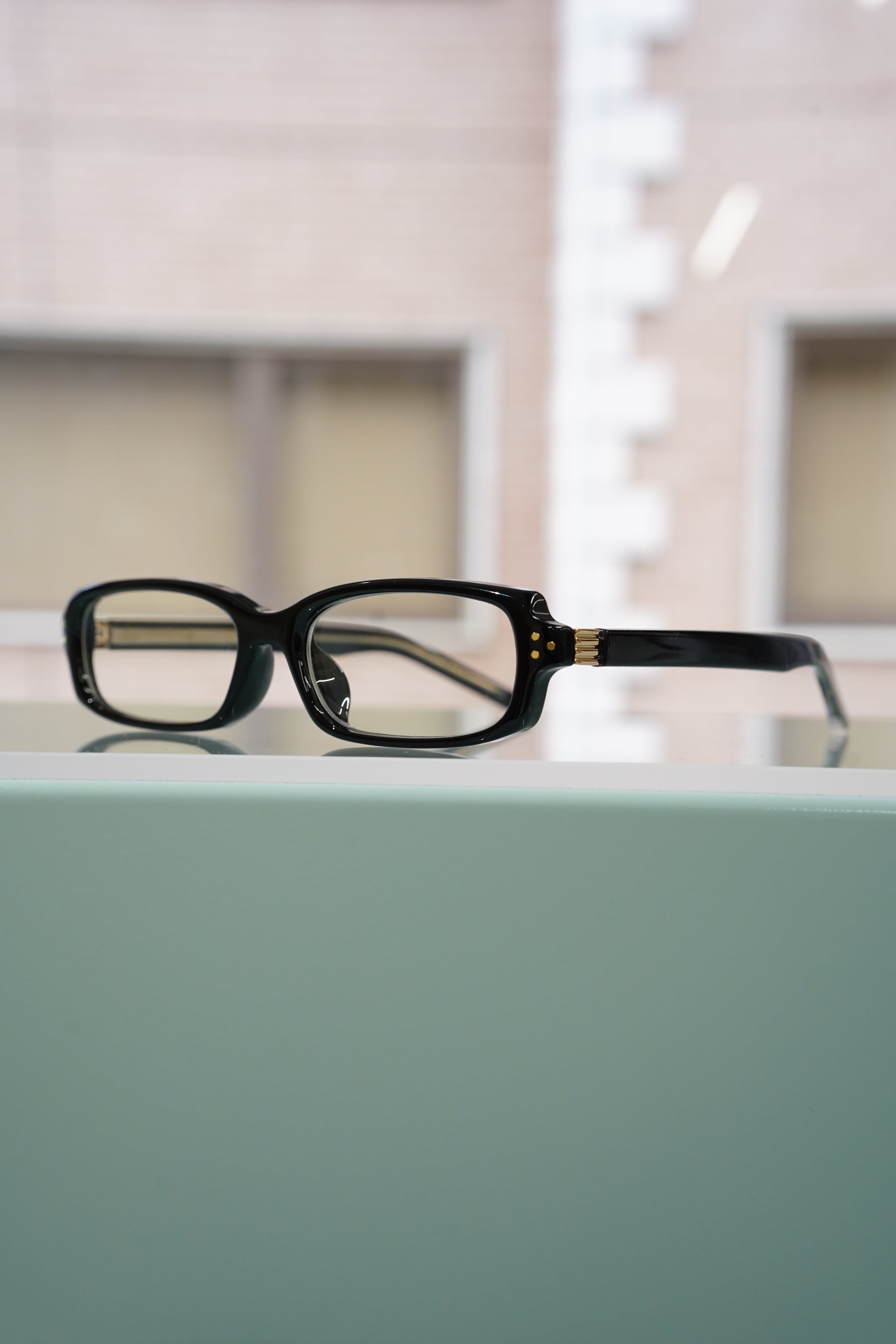 横に細長いレンズが特徴のこのメガネは、スタイリッシュな印象を与え、日常のファッションに華を添えます。