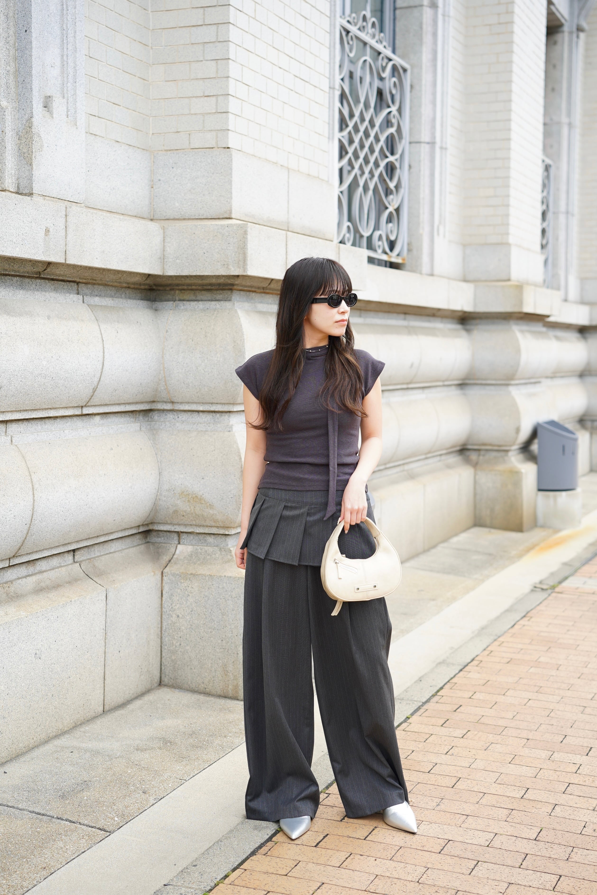 上品なタイがアクセントになり、シンプルながらも印象的なスタイルを演出します。